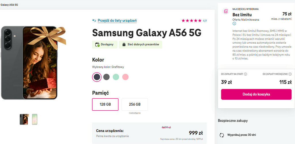 Na t-mobile.pl znajdziesz Samsunga w wersji 128 GB. Opcja pamięciowa 256 GB jest już niedostępna. Jego oferta w T-Mobile jest zdecydowanie najniższa na rynku (choć w abonamencie). Dla porównania ten sam Samsung Galaxy A56 128 GB kosztuje w sklepach bez umowy min. 1214 złotych.