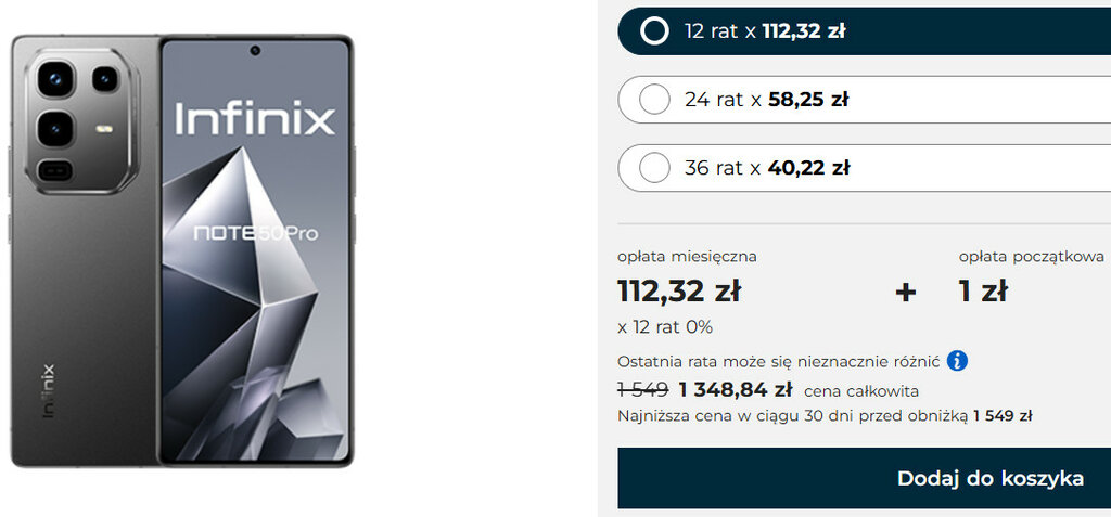 Jak na ironię, mimo całkiem sporej przeceny możesz znaleźć Infinixa Note 50 Pro z pamięcią 8/256 GB w jeszcze niższej cenie, bo od ~1098 złotych. Jeśli jednak zależy Ci na ratach, oferta Plusa/Plusha będzie jak najbardziej OK.