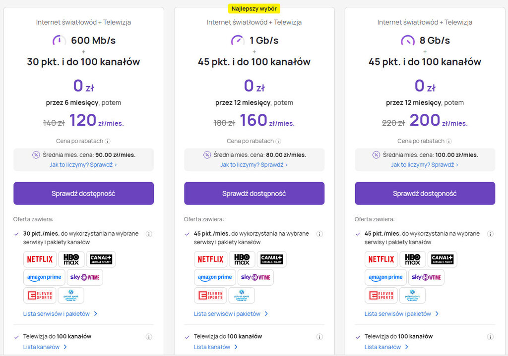 Fioletowy operator oferuje obecnie swoje pakiety (z prędkościami łącza od 300 Mb/s do 8 Gb/s) za odpowiednio 115, 120, 160 i 200 złotych. Każdy z nich jest teraz objęty rabatem -20 zł każdego miesiąca. Telewizja Nowej Generacji Play oferuje dostęp do 100 kanałów, a największa różnica tkwi w prędkości internetu światłowodowego.