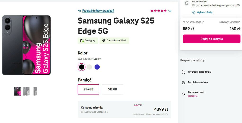 A przecież ten sam Samsung Galaxy S25 Edge 12/256 GB może Cię obecnie kosztować tylko 2658 złotych, a więc o aż 50,8% taniej niż standardowa oferta T-Mobile! Ba – jest to taniej nawet od ceny promocyjnej operatora z okazji Black Week i to o aż 39,6%. W tym konkretnym przypadku promocja Black Friday/Black Week w ogóle nie ma żadnego sensu.
