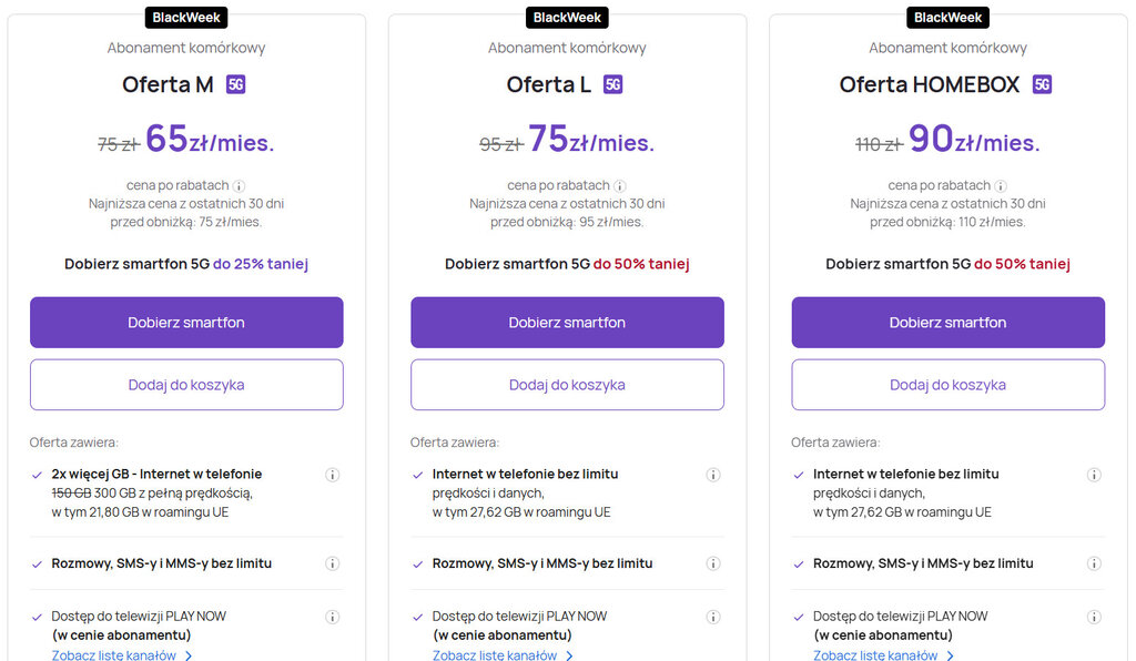 W ten sposób możesz zamówić pakiet Homebox w cenie niższej niż plan L w standardowej cenie. Dodam tylko, że te dwa abonamenty zapewniają nie tylko nielimitowane usługi głosowe i tekstowe w kraju i w roamingu UE oraz telewizję Play NOW, ale także nielimitowany transfer 5G w telefonie. Umowa podpisywana jest na standardowe 24 miesiące.