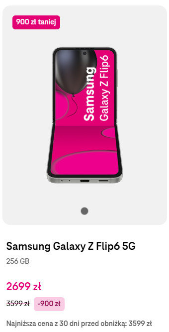 Oczywiście jest droższy od wersji 256 GB, ale chodzi też o to, że w innych sklepach znajdziesz go w lepszej cenie. O ile Samsung Galaxy Z Flip6 256 GB kosztuje w innych sklepach niecałe 3000 złotych lub więcej, o tyle model 512 GB możesz upolować już za ~3225 złotych. W jego przypadku oferta T-Mobile jest więc całkowicie niekorzystna.