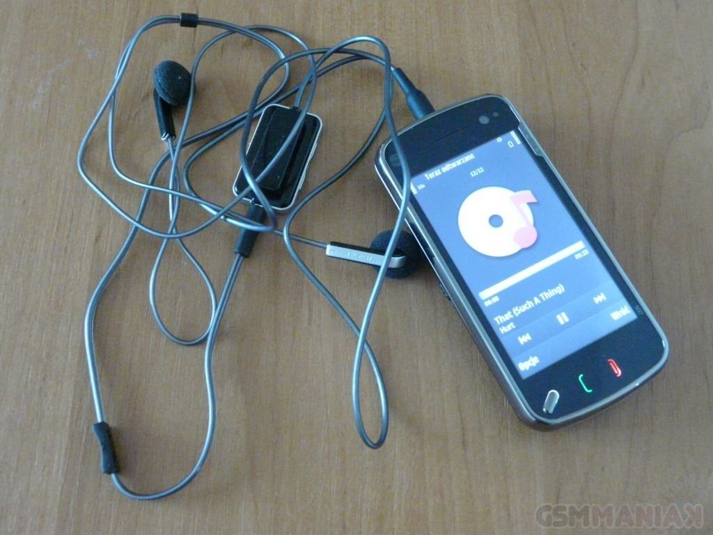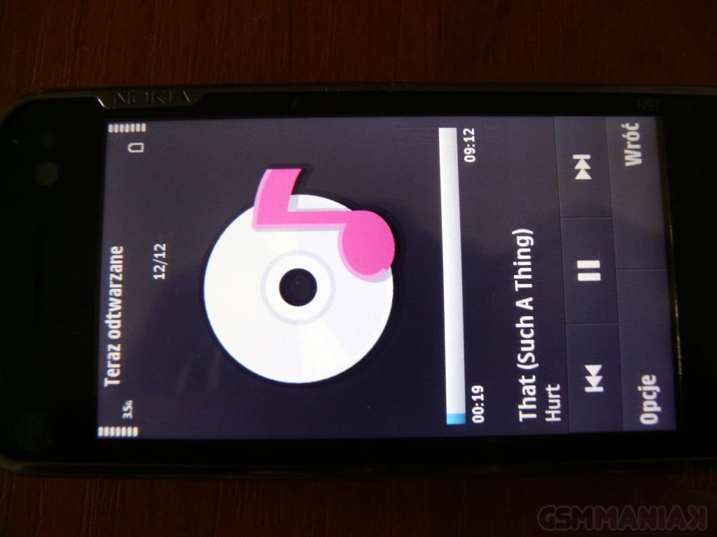 Telefon za to posiada bardzo dobry odtwarzacz mp3 (obsługiwane formaty: MP3, AAC, eAAC, eAAC+, WMA ). Pod tym względem N97 nie ustępuje w niczym typowo muzycznym komórkom. Do tego dochodzą, dodawane w zestawie firmowe słuchawki Nokii, które mimo iż nie należą do najwyższej półki, grają bardzo przyzwoicie i ciężko się przyczepić do jakości wydobywającego się z nich dźwięku. Trochę gorzej jest z wbudowanymi głośnikami, które strasznie szumią podczas głośniejszego odtwarzania muzyki. Niemniej, ogólnie byłem zadowolony z ich jakości. Dodam jeszcze, że kontrolę nad playlistą możemy sprawować przy użyciu znajdującego się na ekranie Home apletu odtwarzacza lub korzystając z wbudowanego w słuchawki pilota. W zakładce „Muzyka” dodatkowo mamy bezpośredni skrót do muzycznego sklepu Nokii.