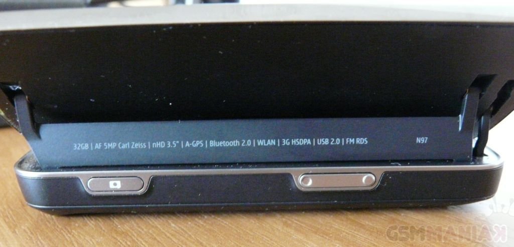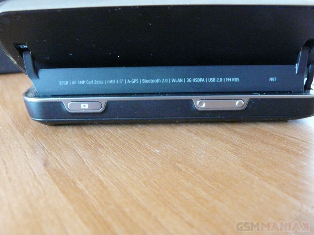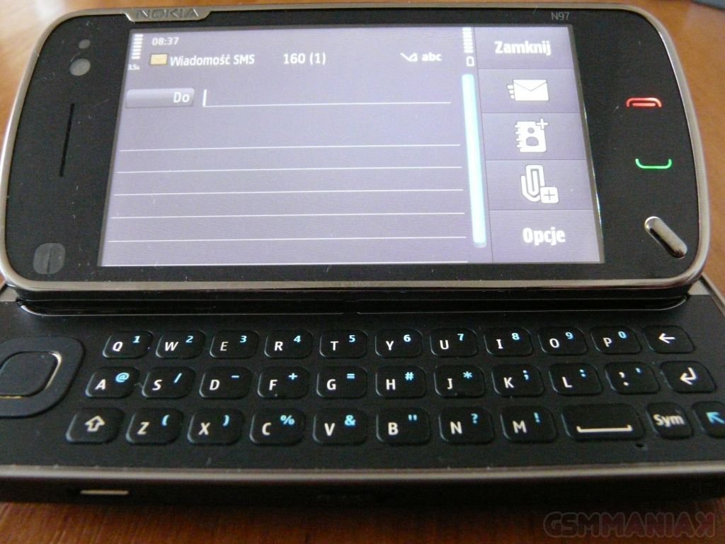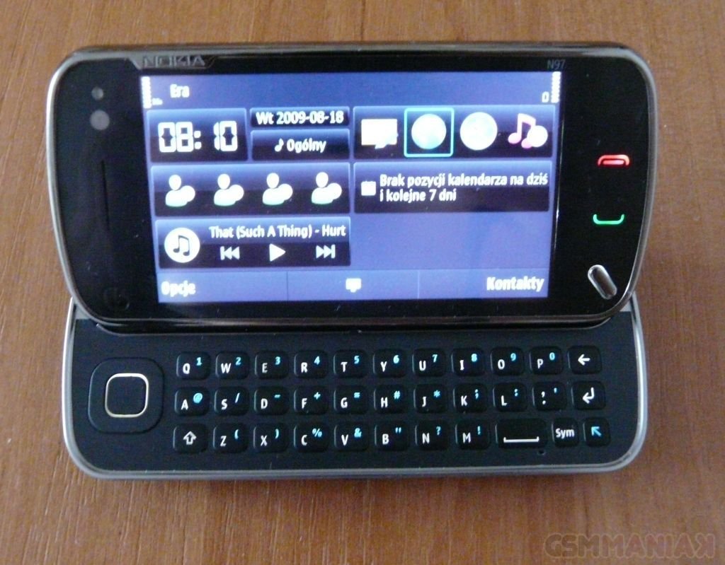 N97 na pierwszy rzut oka prezentuje się bardzo dobrze. Prawie cały przód telefonu zajmuje duży, dotykowy ekran, pod którym znajdziemy trzy przyciski: Menu, Zadzwoń i Zakończ. Z kolei nad wyświetlaczem znajdziemy: głośnik, kamerkę do wideorozmów, czujnik światła oraz czujnik zbliżeniowy. Po bokach umieszczono: spust migawki aparatu, kontrolery głośności (a także zoomu podczas robienia zdjęć), przycisk Power, wejście słuchawkowe, port USB, lampkę wskaźnika ładowania oraz przełącznik służący do blokowania telefonu. Z tyłu telefonu znajduje się opatrzony przesłoną (której opuszczenie automatycznie włącza aparat) obiektyw aparatu z podwójną lampą błyskową. Po rozsunięciu urządzenia, na wzór HTC, ekran unosi się pod kątem rozwartym, dzięki czemu korzystanie z telefonu staje się jeszcze wygodniejsze.