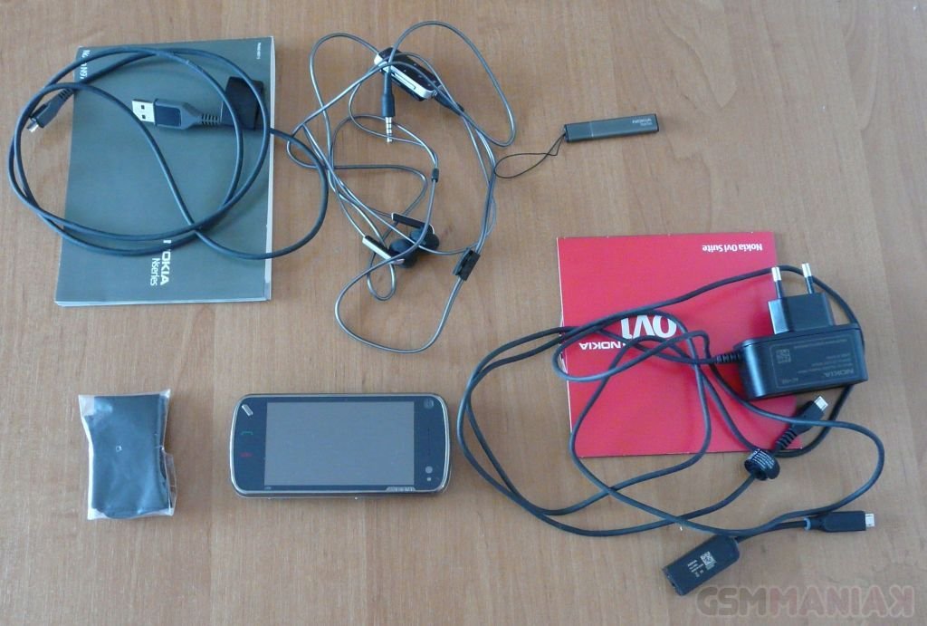 W pudełku obok flagowego modelu Nokii znajdziemy: ładowarkę, dwuczęściowy zestaw słuchawkowy, mało poręczny rysik, adapter do ładowarki (CA-146C), instrukcję obsługi, kartę gwarancyjną, płytę DVD z oprogramowaniem Nokia Ovi Suite oraz szmatkę do czyszczenia telefonu z logiem N-Series.