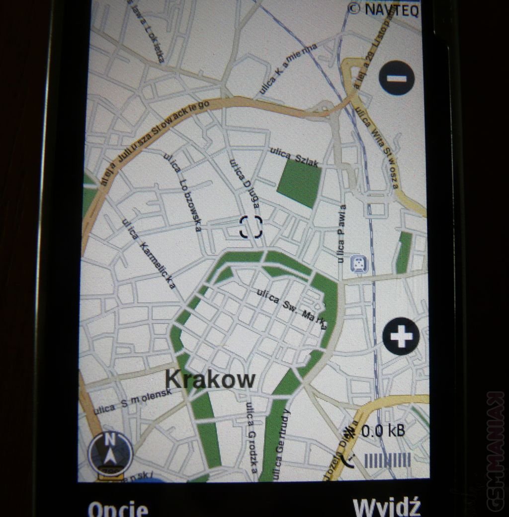 Odbiornik GPS w telefonie działał bardzo sprawnie. Moduł szybko łapał sygnał z satelity i w ciągu kilku chwil po włączeniu Nokia Maps, program z dużą dokładnością pokazał moją aktualną pozycję. Próbowałem także, używać telefonu jak samochodowej nawigacji GPS i muszę przyznać, że mimo chwilowych problemów z odświeżaniem i obracaniem mapy, działał on całkiem przyzwoicie. Niemniej jednak, aby w pełni cieszyć się możliwościami Nokia Maps jesteśmy zmuszeni wykupić płatną licencję.