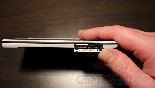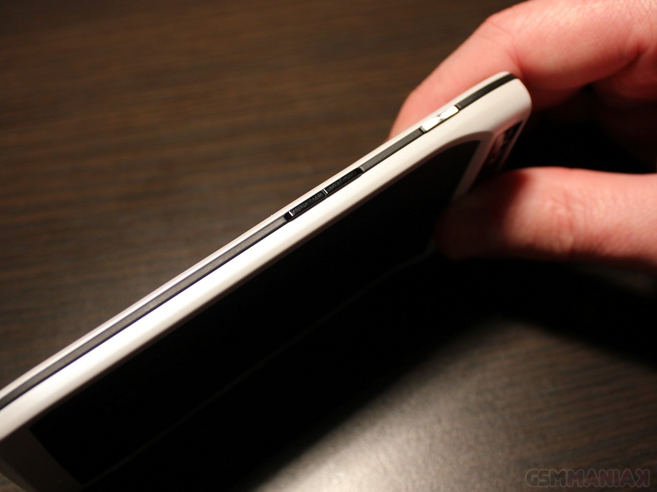 Lewa strona urządzenia, pod plastikową klapką skrywa sloty kart microSIM i microSD (obsługiwane do 32 GB). Klapka to jedyny ruchomy element RAZR’a, gdyż bateria telefonu jest weń wbudowana na stałe i pozwala na wymianę jedynie w serwisie. Dodam również, że wymiana karty SIM na micro SIM okazała się dla mnie nie lada wyzwaniem (T-Mobile), lecz jest to materiał na zupełnie inny artykuł. RAZR od spodu nie posiada żadnych wejść, jest natomiast w tym miejscu zwężony aż do 6 mm grubości!