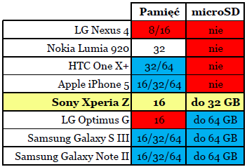 Inna sprawa tyczy się ilości pamięci RAM, czyli między innymi ilości programów jakie mogą pracować jednocześnie. Tutaj prym wiodą modele LG, Xperia Z i Note II. Co ciekawe, obydwa modele LG nie odstają tu od Xperii, wyposażone w niemalże identyczny hardware. W tabeli najgorzej wypada Galaxy S III, z najwolniejszym transferem danych, bez LTE. Aczkolwiek, lada moment na rynku pojawi się Galaxy S IV – największy potencjalny rywal Xperii Z na naszym rynku (wciąż nie wiadomo co z HTC Butterfly).