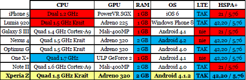 Najbezpieczniej jest podzielić procesory na dwu i cztero-rdzeniowe. Neleży jednak mieć na uwadze, że od tego podziału – do realnej wydajności jest raczej daleko. Z pewnością jednak rdzenie Krait’a możemy uznać za te „lepsze”, podobnie jak GPU: Adreno 320. Kolejna sprawa to wydajność samego systemu operacyjnego, nie wspominając już o nakładkach producentów… Jeżeli jesteście smartfonowymi graczami i zależy Wam na wydajności własnie pod tym kątem, radzę poczekać na benchmarki i przyjrzeć się modelom z największymi ekranami – Note II, Xperii Z i Galaxy S III. Poza silną, grającą grupą – CPU i GPU w żadnym z wymienionych w tabeli modeli – Was nie zawiedzie.