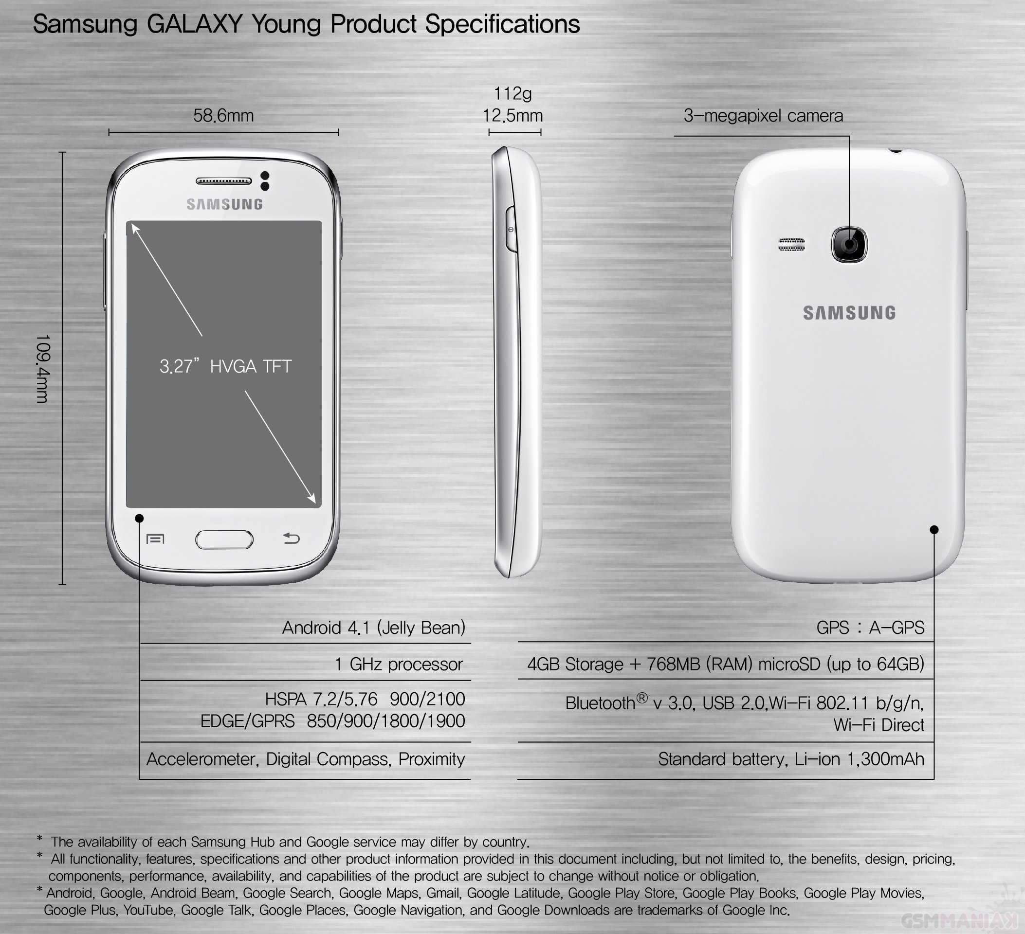 Ponadto na wyposażeniu nie zabrakło miejsca dla 3-megapikselowego aparatu głównego, odbiornika GPS, Bluetooth 3.0, modułu sieci bezprzewodowej WiFi z funkcją WiFi Direct, akcelerometru, kompasu cyfrowego, czujnika zbliżeniowego, portu USB 2.0 oraz akumulatora o pojemności 1.300 mAh. A to wszystko zamknięte w obudowie o wymiarach 109.4 x 58.6 x 12.5 mm. Samsung Galaxy Young zadebiutuje w dwóch wariantach – Dual SIM oraz z pojedynczym slotem kart SIM. Najprawdopodobniej pojawi się za kilka tygodni podczas Mobile World Congress 2013 w Barcelonie.