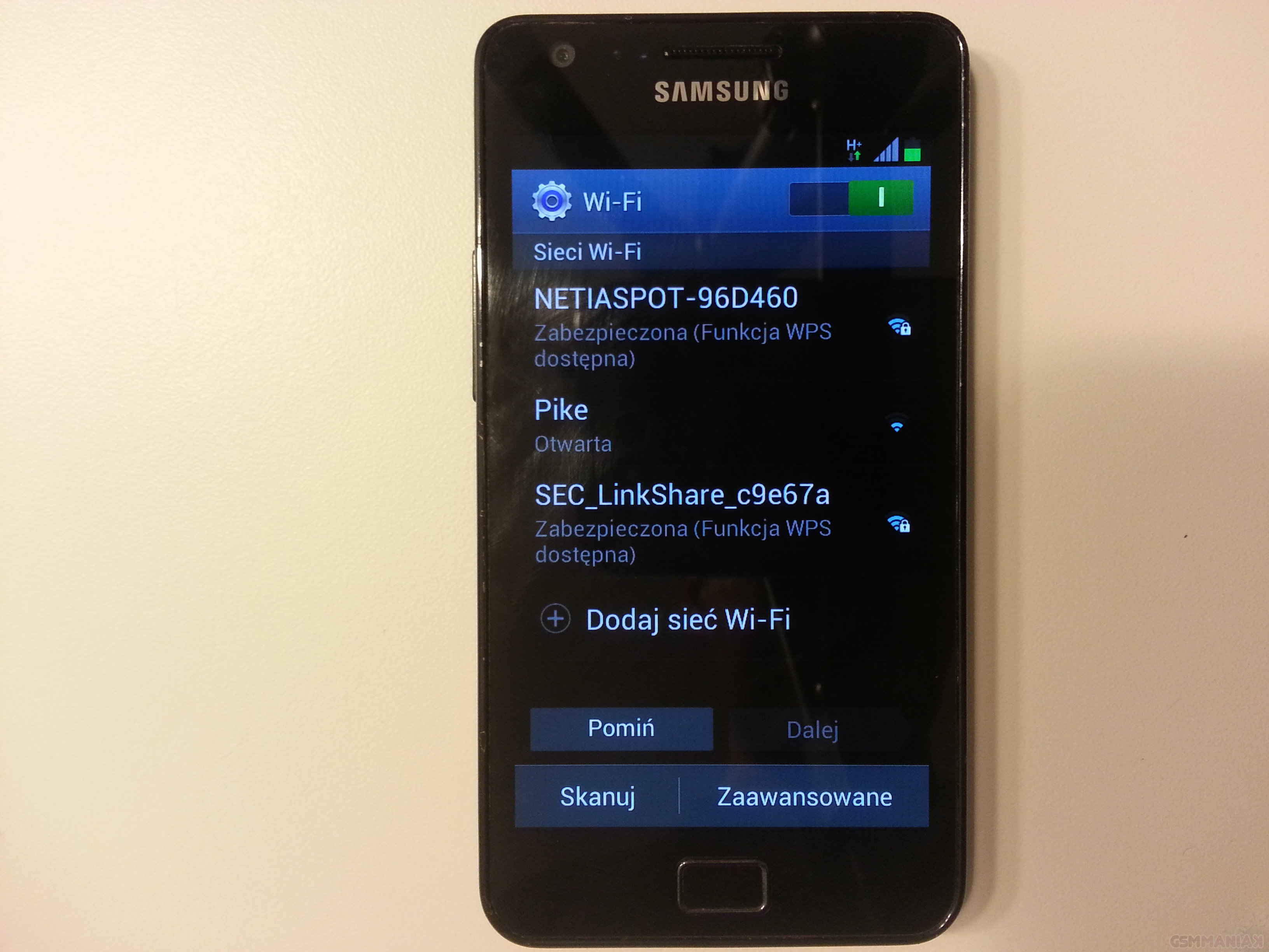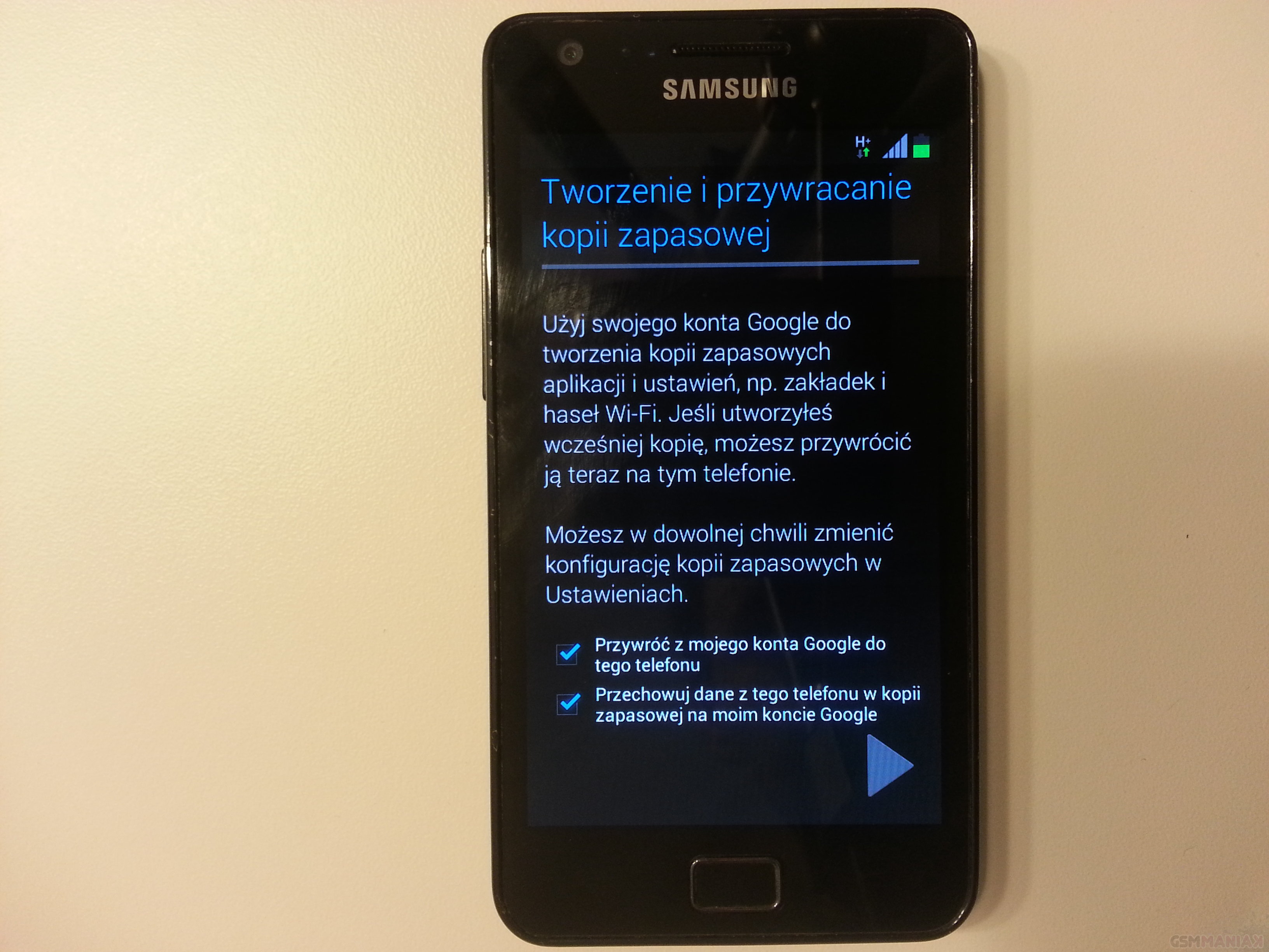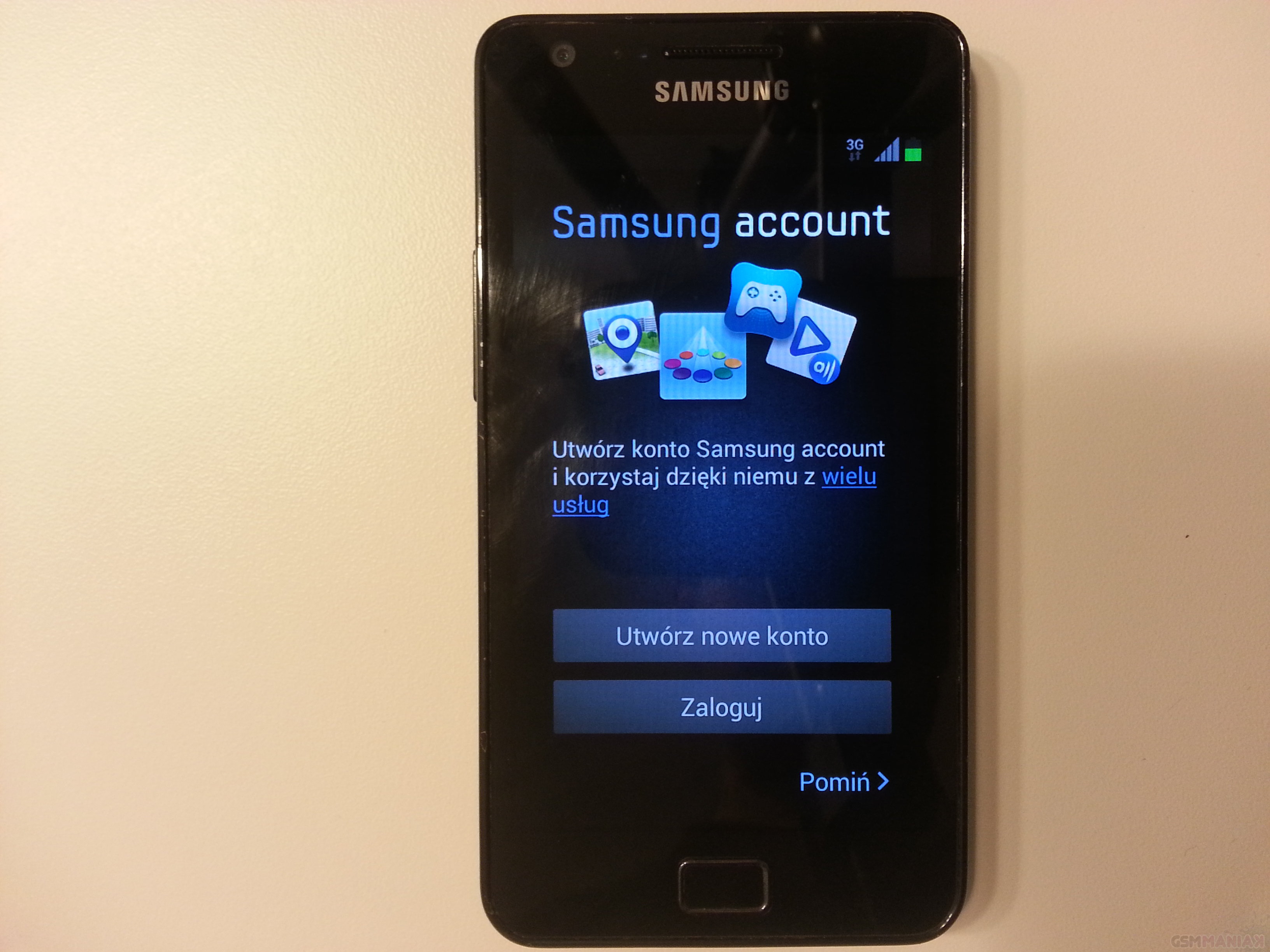 Po wpisaniu kodu PIN pojawia się nam ekran z wyborem języka. Później wybieramy sieć WiFi. Następnie widzimy okno, w którym możemy wybrać czy chcemy zalogować się do konta Samsung czy też utworzyć nowe. Połączenie się z serwerami Samsunga zaowocuje usługami takimi jak Samsung Apps ale o tym w innej części.