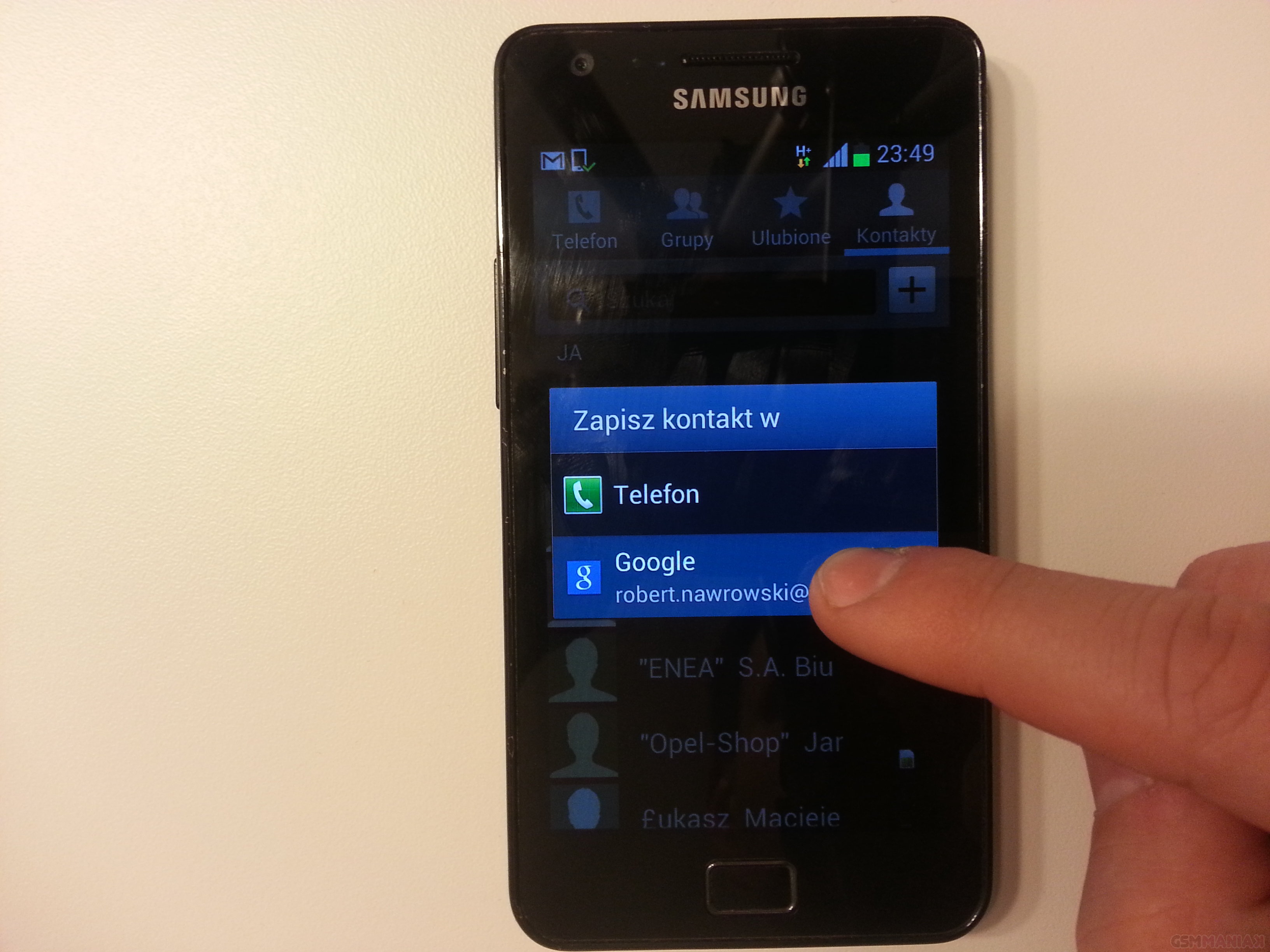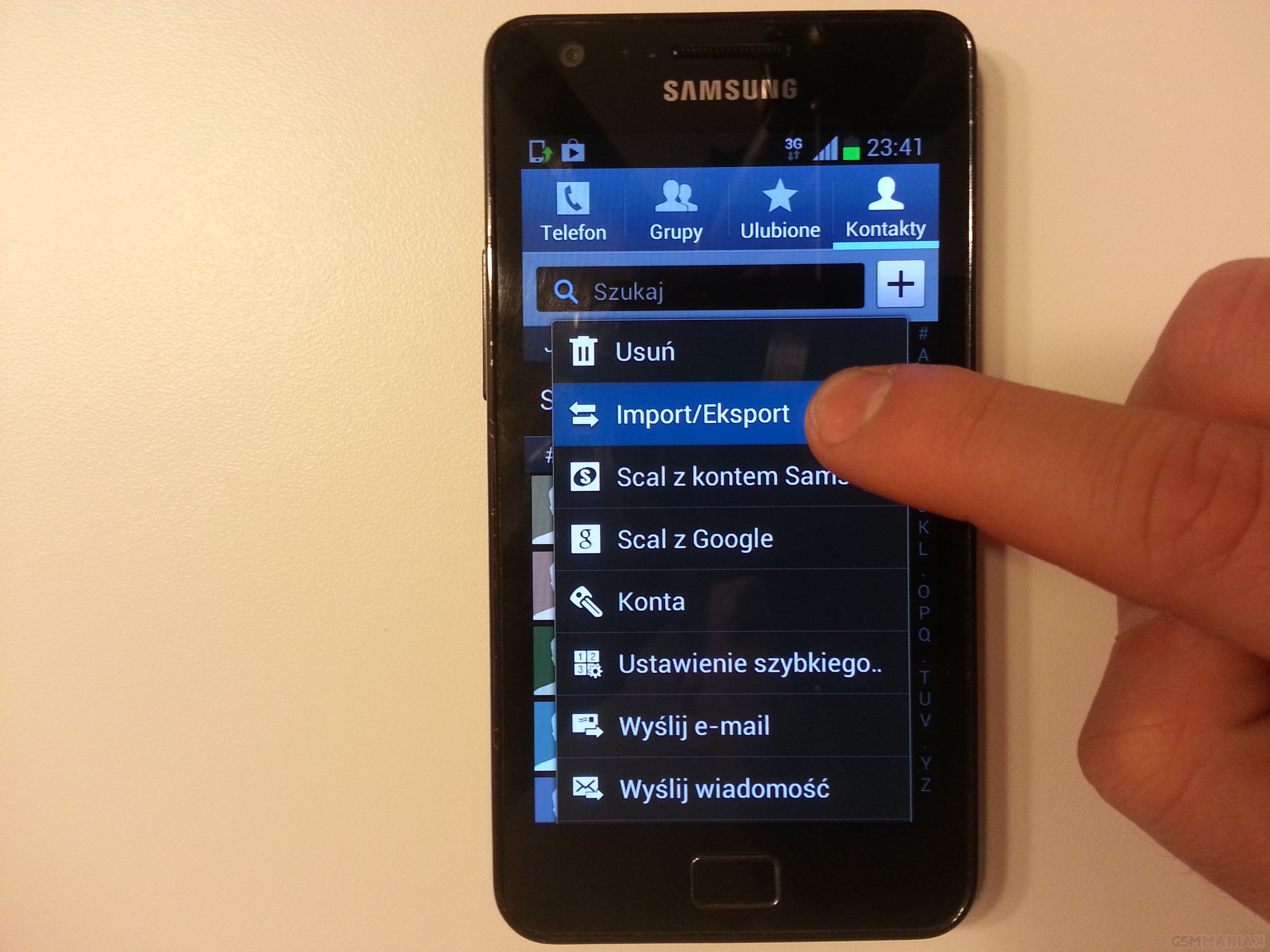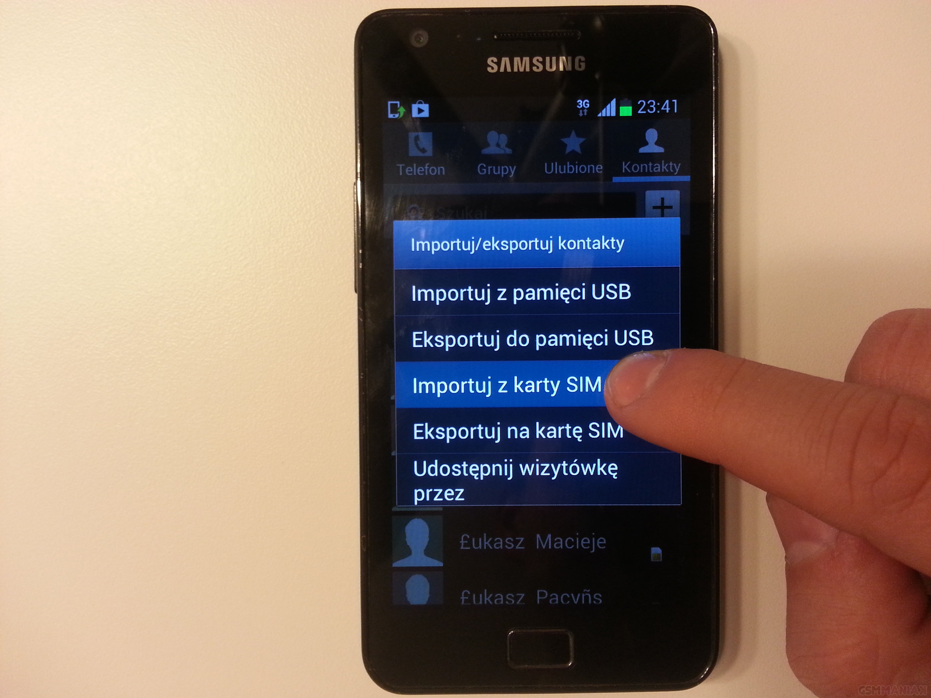 Klikamy na przycisk menu, a później Import/Eksport. Kolejno naciskamy Importuj z karty SIM. Zaznaczamy wszystkie kontakty i potwierdzamy dotykając Google z naszym loginem.