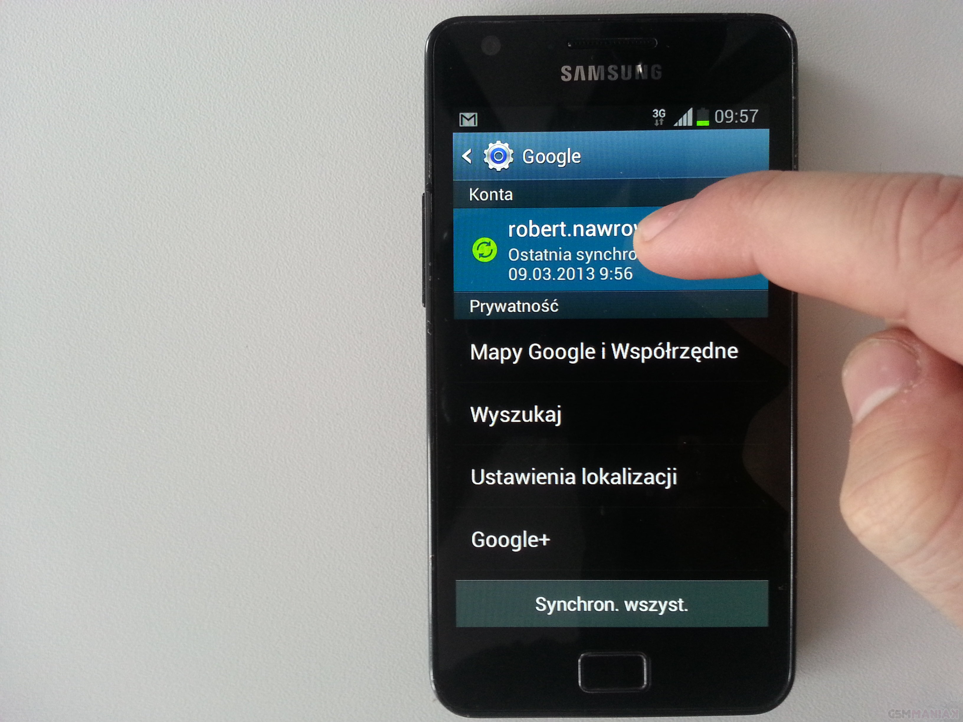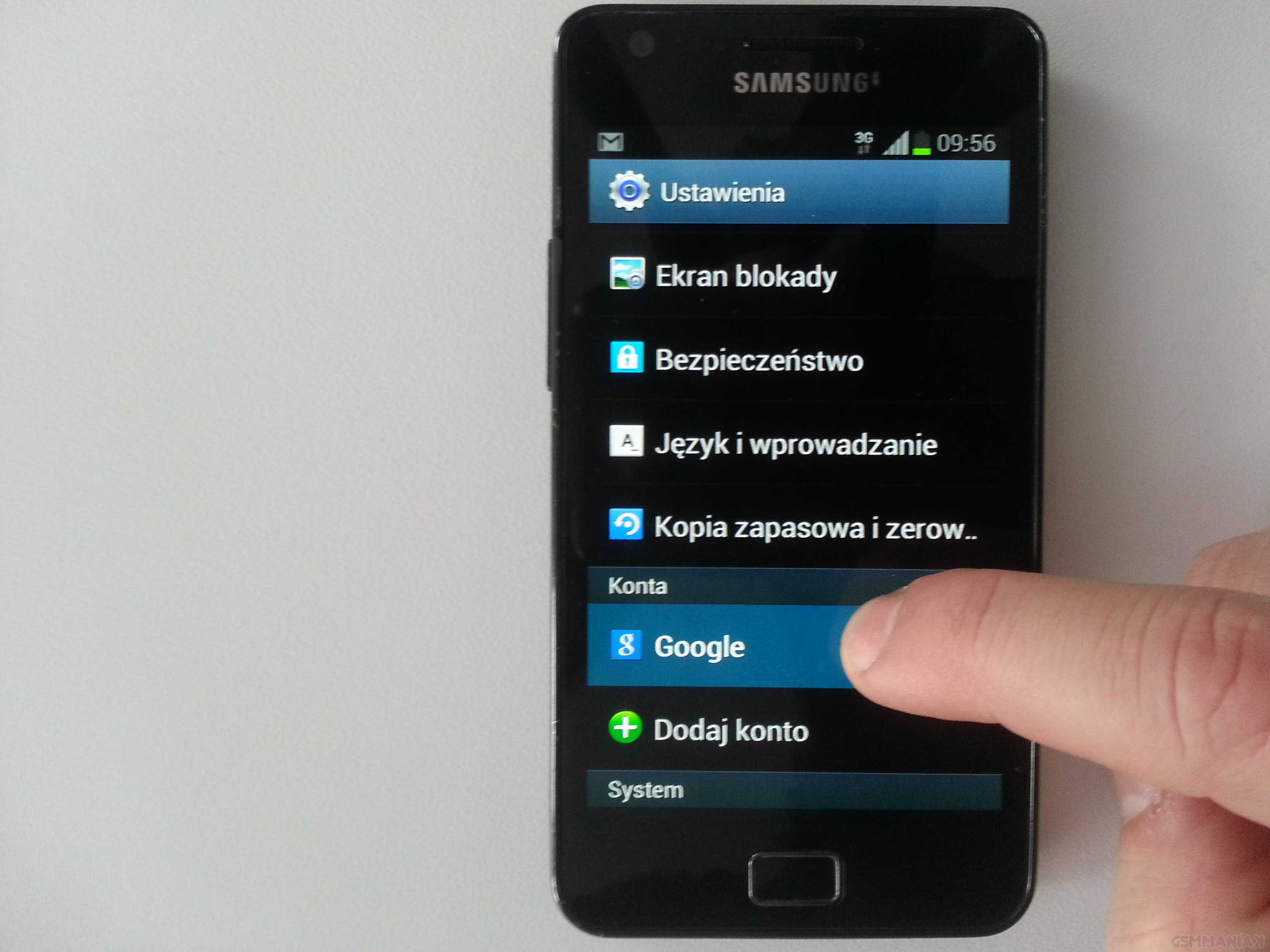 Kontakty zostaną wysłane na serwer Google. Musimy jeszcze tylko upewnić się czy mamy włączoną synchronizację. Domyślnie powinna ona być włączona ale lepiej się upewnić. Przechodzimy do ustawień, następnie konta oraz wybieramy Google.