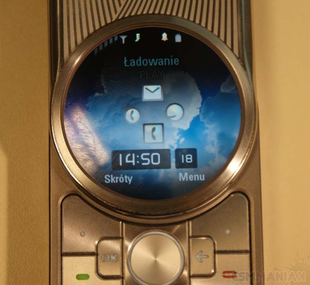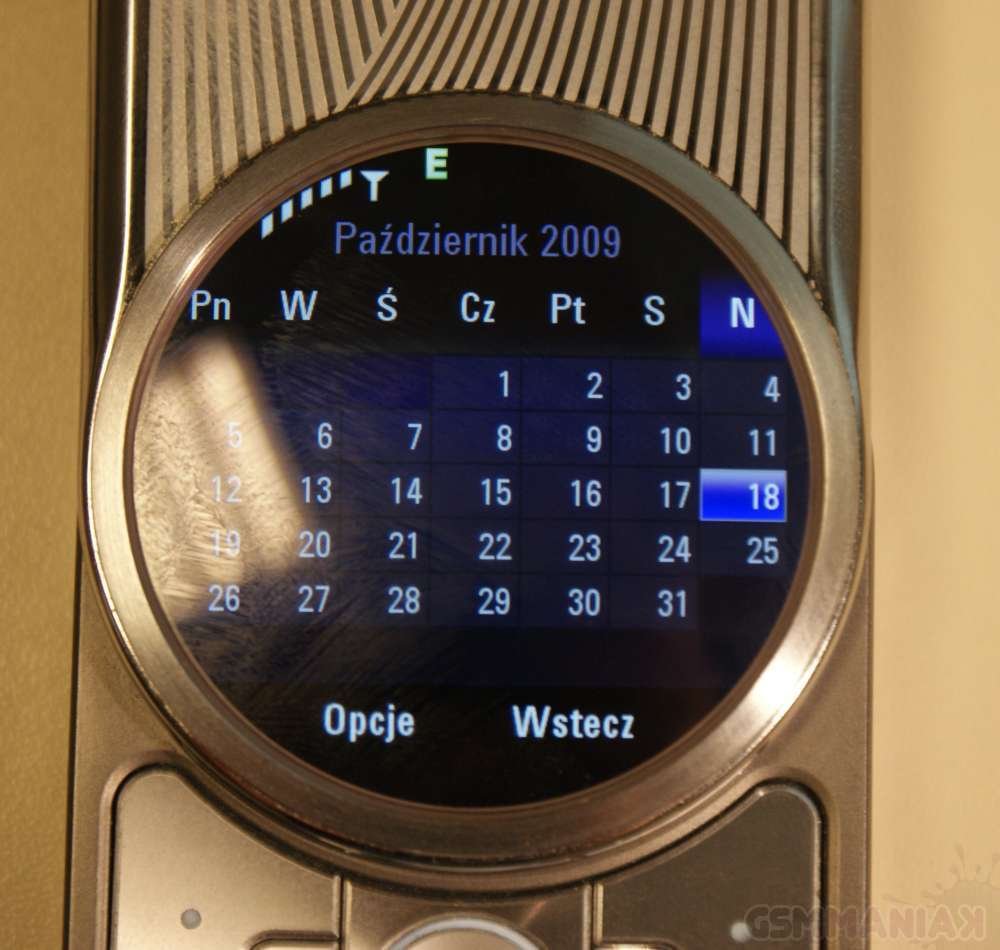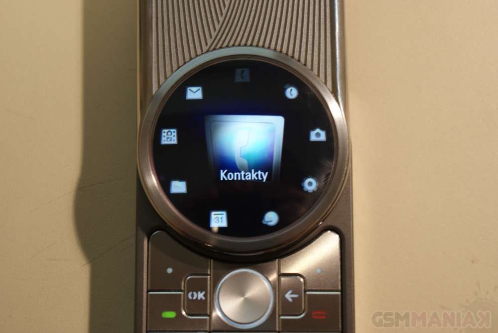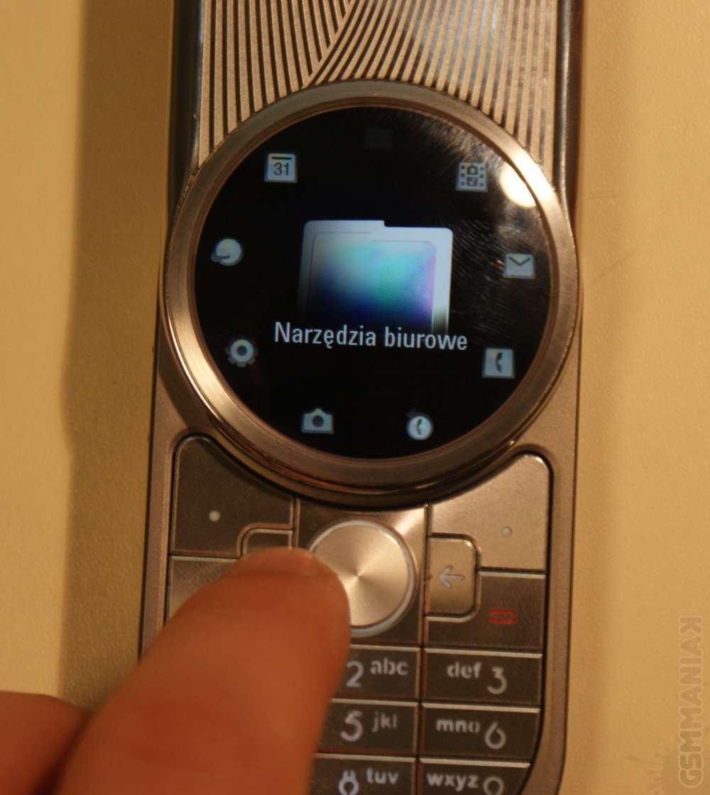 Niespodzianki zaczynają się dopiero w Menu, gdzie ikonki funkcji telefonu rozłożone są po okręgu a aktualnie wybrana, pokazywana jest w powiększeniu na środku ekranu. Wśród nich znajdziemy: Kontakty, Ostatnie połączenia, Aparat, Ustawienia, Internet (przeglądarka internetowa), Kalendarz, Narzędzia (czas na świecie, alarm, kalkulator, menadżer plików oraz kalendarz), Rozrywka oraz Wiadomości. Muszę przyznać, że w połączeniu z wypukłym wyświetlaczem całość prezentuje się po prostu świetnie.