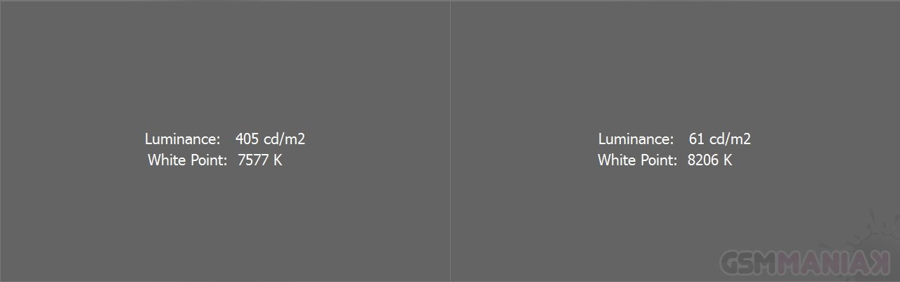 Maksymalna jasność ekranu, przy stuprocentowej sile podświetlenia, wynosi 405 kandeli na metr kwadratowy, minimalna z kolei – 61 cd/m2.