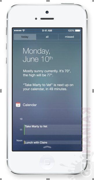 Jak wyżej – iOS 7 obsługuje nie tylko centrum notyfikacji po odblokowaniu, ale też (wreszcie) wtedy, gdy ekran jest zablokowany. Nowy design jest zupełnie odmienny od dotychczasowego – zamiast imitacji ciemnoszarego płótna, otrzymujemy półprzezroczystą powłokę z szybkim podglądem najważniejszych informacji