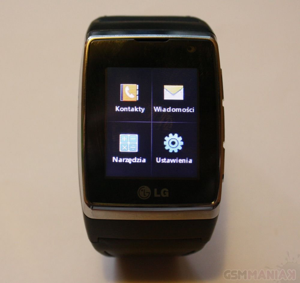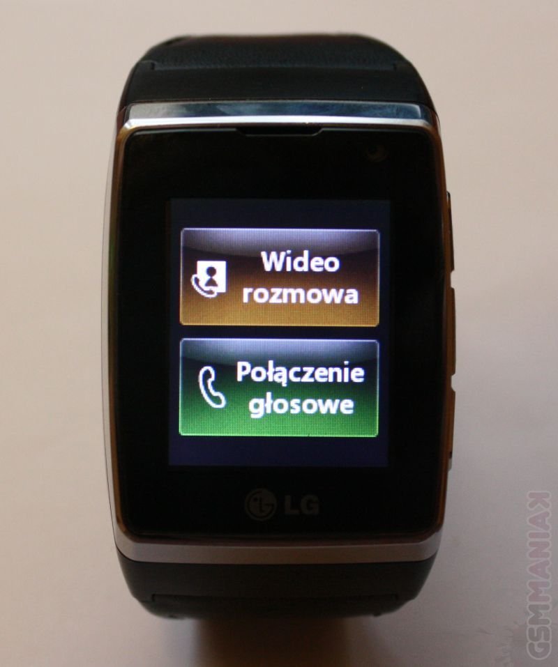 Centralną częścią telefonu LG jest dotykowy ekran, który, tak jak każdy porządny zegarek, w stanie wygaszenie wskazuje aktualną godzinę. Nad wyświetlaczem znajdziemy kamerkę do wideorozmów, a pod nim zaś logo LG. Po prawej stronie producent umieścił trzy przyciski funkcyjne: Zadzwoń (odsyła także do historii połączeń), Cofnij oraz Zakończ (a także Włącz/Wyłącz), których podwójne wciśnięcie wybudza telefon. Pod spodem znalazło się złącze ładowarki oraz denko, pod którym schowany został slot kart SIM.