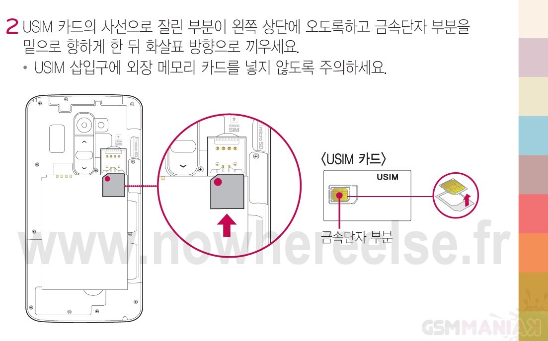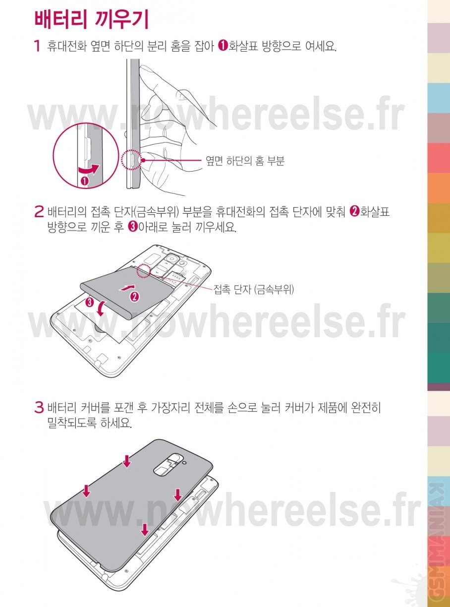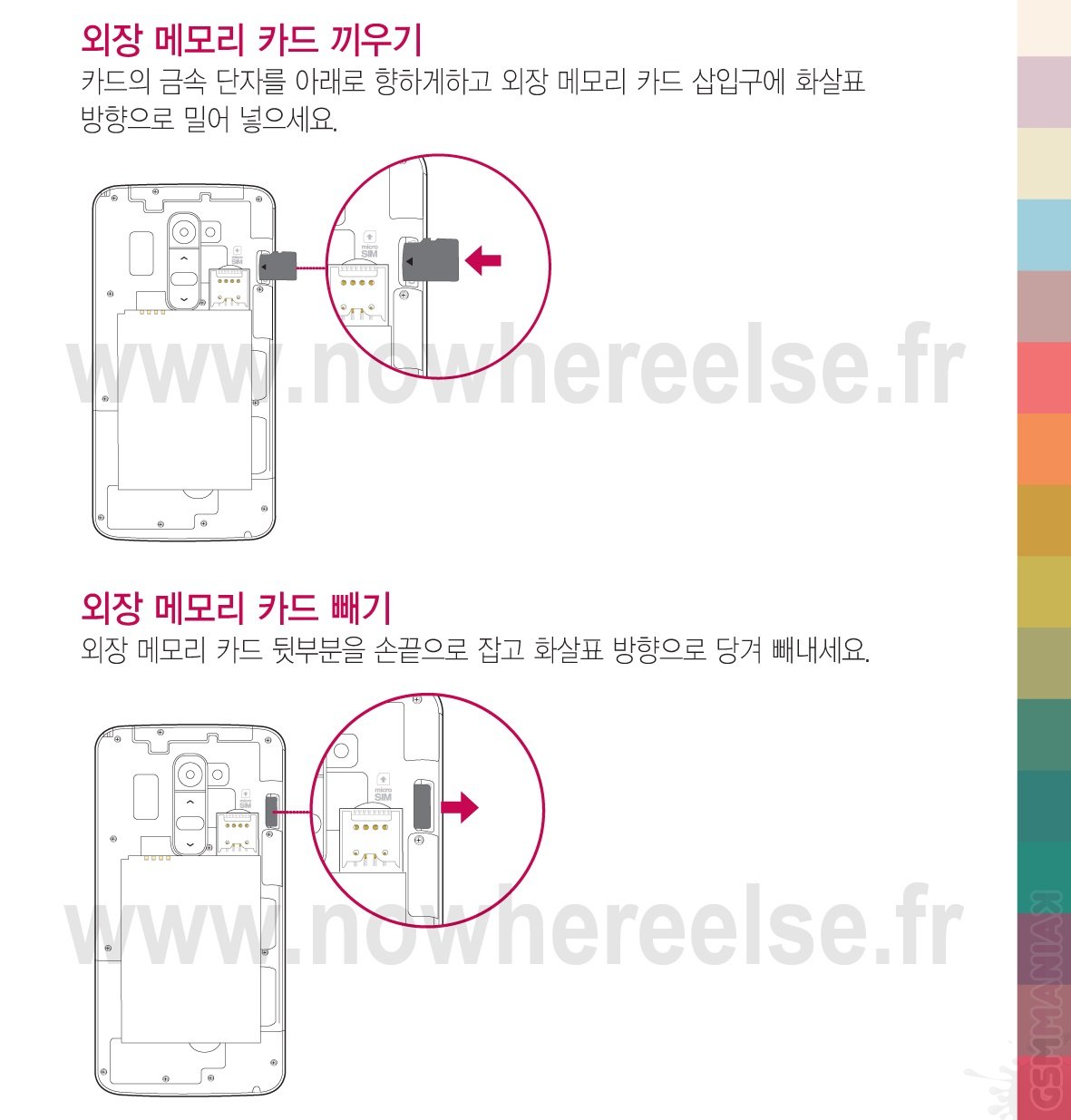 Jeden z zagranicznych serwisów opublikował kilka stron z instrukcji obsługi z której jasno wynika, że LG G2 będzie trzecim urządzeniem (Apple iPhone 5 i Motorola Moto X) wyposażonym w slot kart nano SIM. Z tych kilku stron wynika również, że potencjalny nabywca będzie miał możliwość rozbudowy 32-gigabajtowej pamięci poprzez wykorzystanie czytnika kart micro SD a także wymianę akumulatora o pojemności 2.610 mAh gdy zajdzie taka potrzeba.
