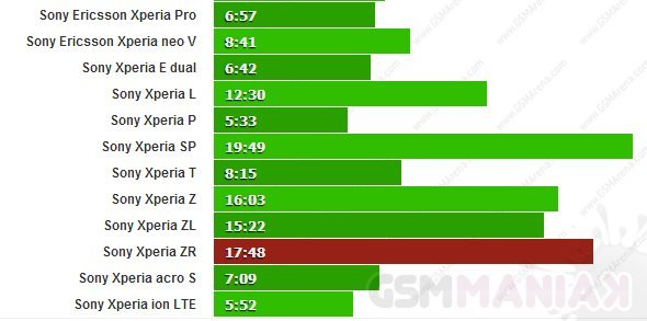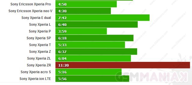 Jak widać na powyższych obrazkach, czas pracy baterii w Xperii ZR jest w większości przypadków dużo lepszy od innych telefonów japońskiego producenta. Podczas rozmowy przegrywa tylko z Xperią SP, ale za to jest lepsza od Xperii Z o prawie 2 godziny. W przeglądaniu internetu bije o prawie 5 godzin 5 calowego flagowca oraz o 2 godziny podczas oglądania filmów. Jest to oczywiście spowodowane mniejszym ekranem (4,6 cala), który ma rozdzielczość tylko 720p. Oprócz tego oferuje on prawie takie same wrażenie jest Xperia Z, ponieważ z nim również możemy popływać, a dodatkowo bateria jest wymienna.