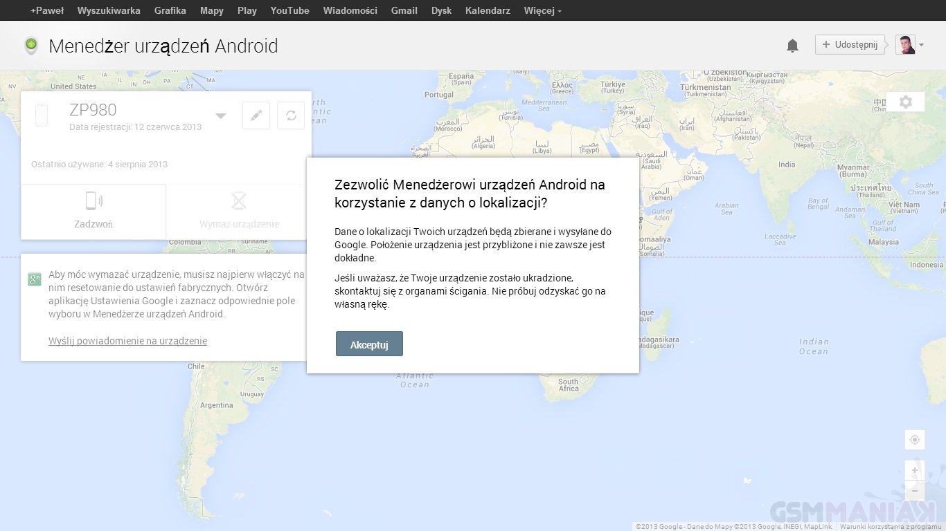Zasada działania oraz namierzania jest bardzo prosta i sprowadza się do kilku prostych czynności. Po pierwsze po wejściu w powyższy link, należy zalogować się do swojego konta Google, po czym zezwolić menedżerowi urządzeń Android na korzystanie z danych o lokalizacji. Po wyrażeniu zgody po chwili Wasze urządzenie z zielonym robocikiem na pokładzie zostanie namierzone o ile wcześniej zaakceptowaliście „Dostęp do mojej lokalizacji”. Dodatkowo Google umożliwia wykonanie połączenia na telefon który będzie dzwonił na maksymalnych wartościach głośności przez pięć minut, tak aby można było go bezproblemowo znaleźć.