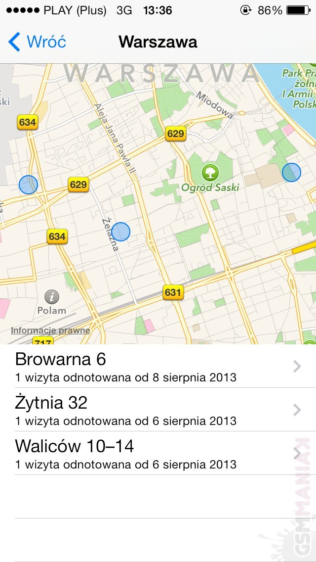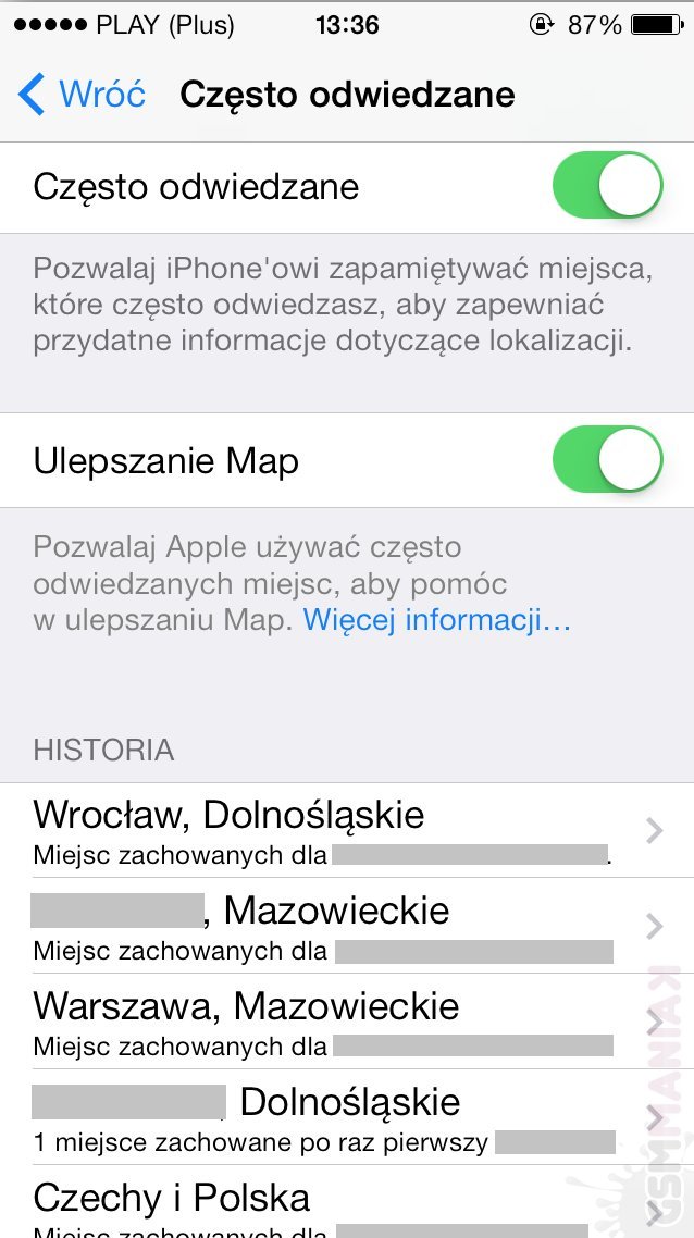 Chwilę po wydaniu piątej bety iOS 7 w ustawieniach prywatności pojawiła się karta „często odwiedzane”. Długo nie trzeba było jej penetrować, aby stwierdzić, że w tym miejscu iPhone kolekcjonuje szczegółowe informacje na temat wszystkich lokalizacji których dokonywaliśmy za pomocą tego urządzenia. Wyświetlane są nie tylko nazwy miejscowości, ale też konkretne daty i godziny lokalizacji. Do tego każdy zapis można wyświetlić na mapie, gdzie z uwzględnieniem kilkusetmetrowego promienia wyświetlana jest wybrana pozycja.