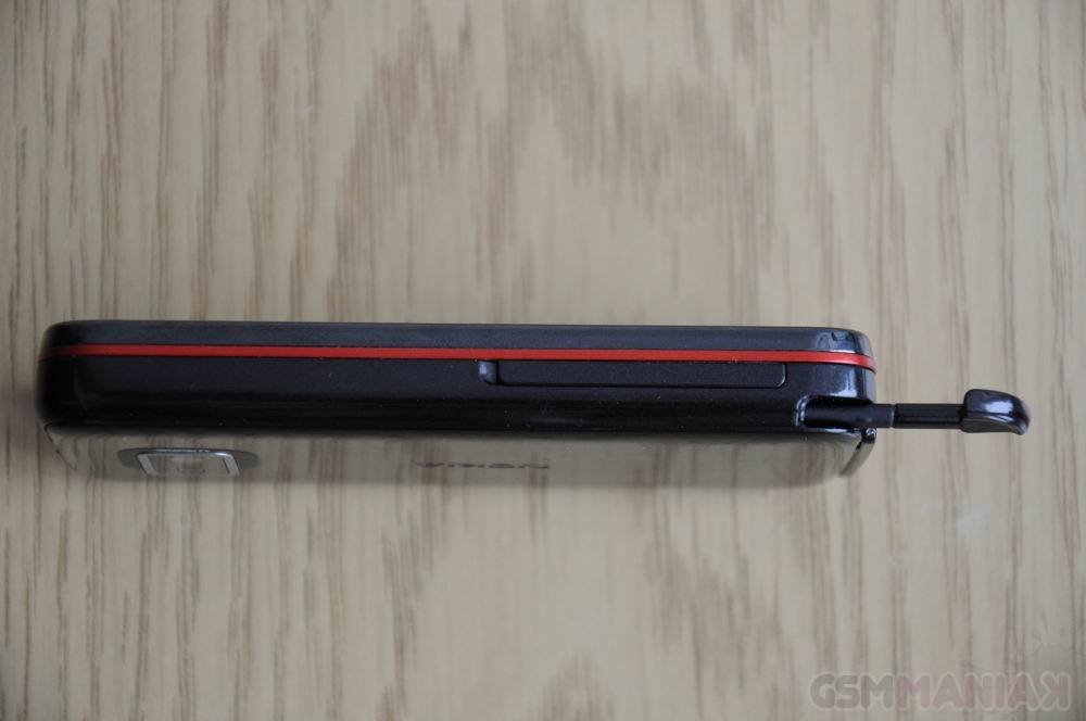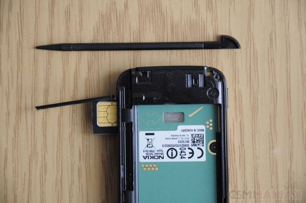 Lewy bok telefonu zarezerwowany jest dla slotów na kartę SIM oraz kartę pamięci microSD, które chronione są zaślepką. O ile włożenie tej drugiej nie sprawia większych problemów (przy braku długich paznokci trzeba pomagać sobie rysikiem), tak w przypadku slotu SIM pojawia się pewna przeszkoda. Aby wyjąć kartę SIM, trzeba otworzyć obudowę, wyjąc baterię, a następnie popchnąć rysikiem brzeg karty. Brzmi to skomplikowanie, ale poniższe zdjęcie wszystko wyjaśni. Również po lewej stronie, schowany jest rysik. Aby z niego skorzystać wystarczy wysunąć go z otworu w brzegu obudowy.