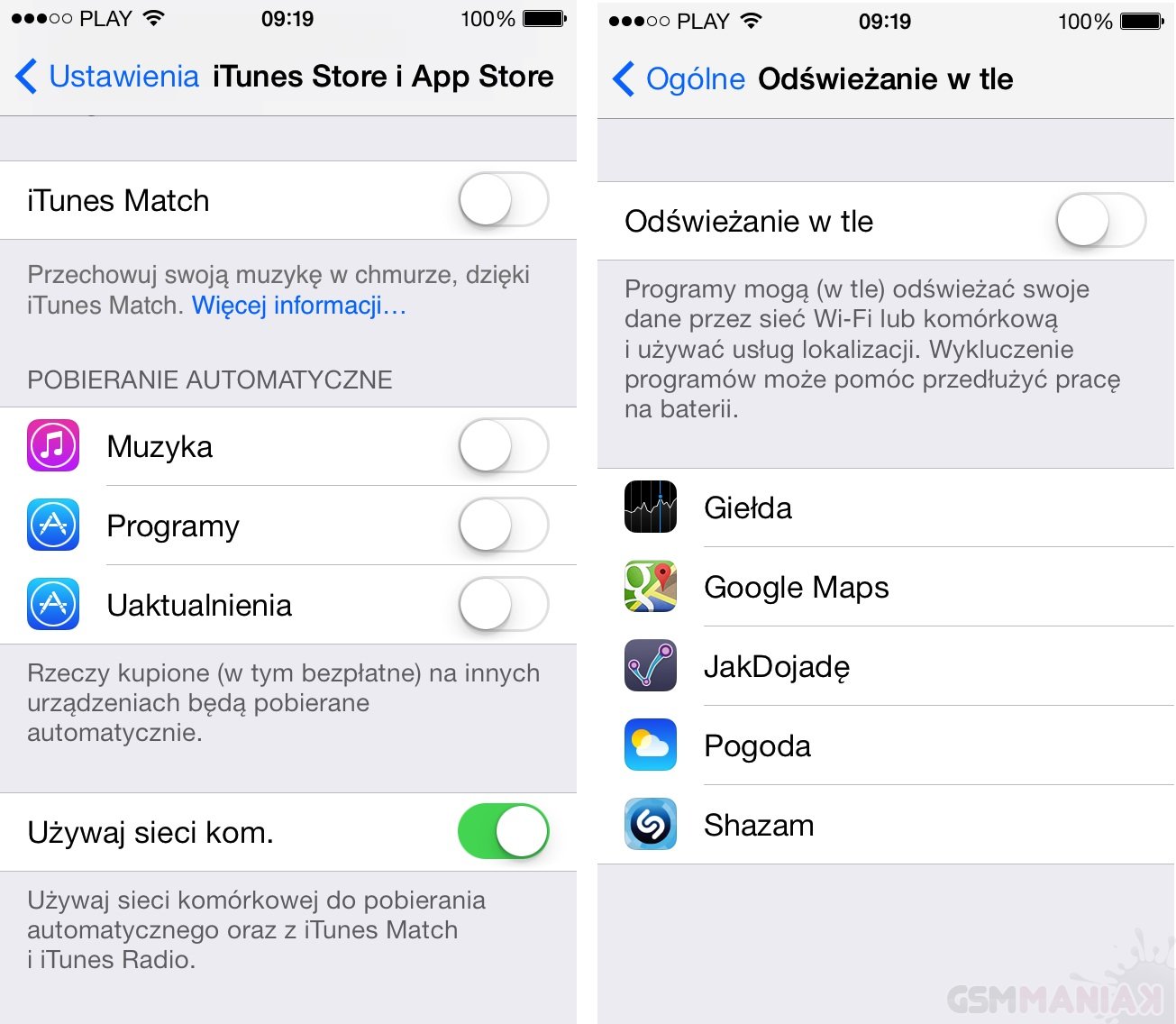 Idąc dalej z tym rozleniwianiem, Apple wyposażył iOS 7 w możliwość automatycznego odświeżania treści w tle. Aplikacje wykorzystujące tę funkcję bez informowania użytkownika pobierają nowe treści, aby po uruchomieniu aplikacji trzeba było czekać na załadowanie informacji. Choć idea jest całkiem przyjemna, to jednak wpływa na zużycie transferu internetowego oraz energii. Wyłącz ją wchodząc kolejno w Ustawienia > Ogólne > Odświeżanie w tle.
