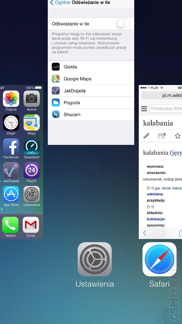 Zmian doczekał się również multitasking iOS-a i to nie tylko wizualnych. Jeżeli masz nawyk wyłączania działających w tle aplikacji i nie wiesz jak je dezaktywować na iOS 7, to wyświetl okno multitaskingu wciskając dwukrotnie przycisk home, a następnie złap palcem okno wybranej aplikacji i przeciągnij go w górę.