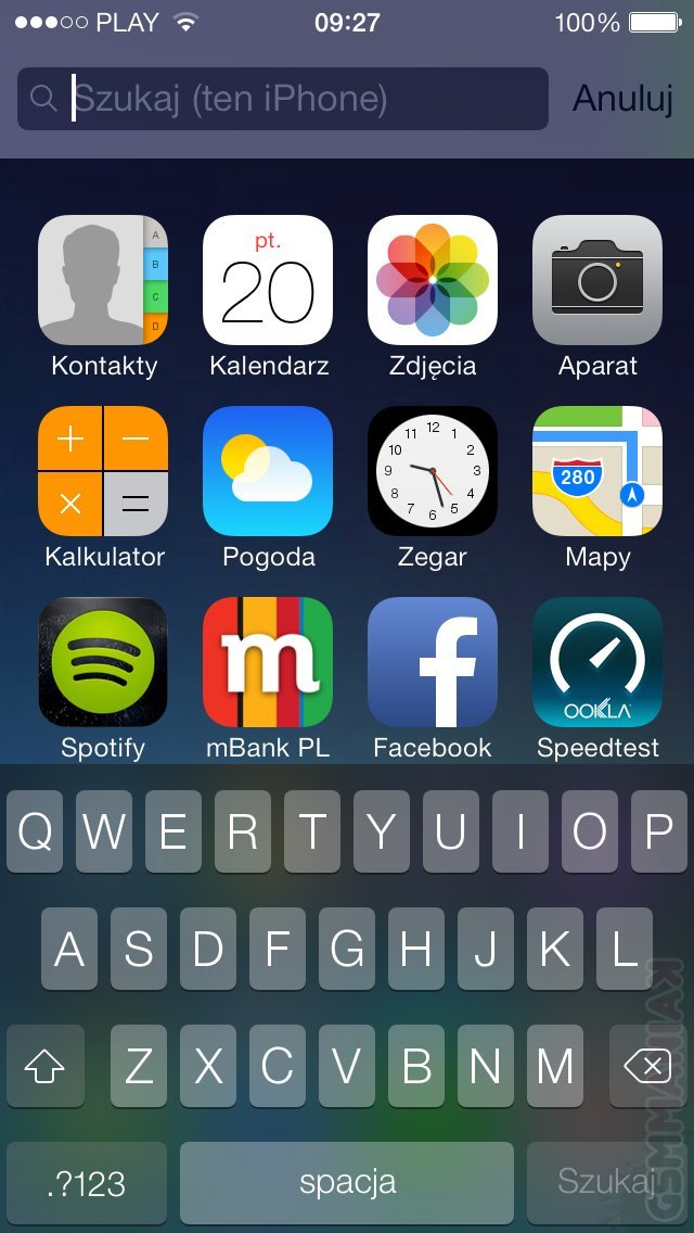 Wraz ze zmianą multitaskingu zmieniono lokalizację systemowej wyszukiwarki spotlight. Chcąc uzyskać do niej dostęp, złap i przeciągnij ikony na home screenie w dół, aby wyświetlić okno wyszukiwania pod status barem.