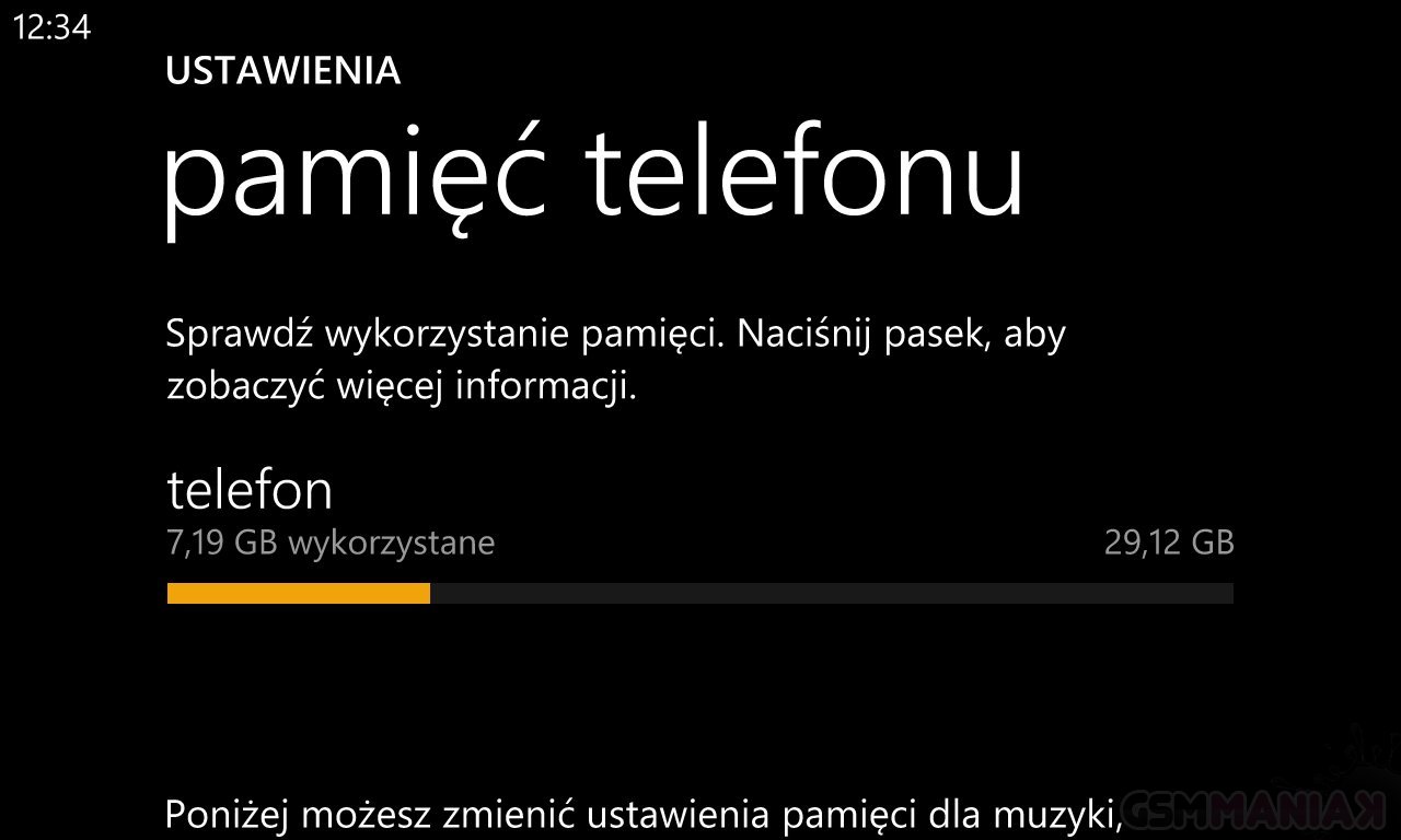 Pamięć systemowa w Lumii 1020 to równo 32 GB, z czego dla użytkownika dostępne jest 29.12 GB – resztę zajmuje system i aplikacje producenta. Co istotne, do sporej części z preinstalowanych programów trzeba ściągać dodatkowe pliki, dlatego też liczcie się z ubytkiem dostępnej przestrzeni. Lumia 1020 nie oferuje slotu na karty pamięci.