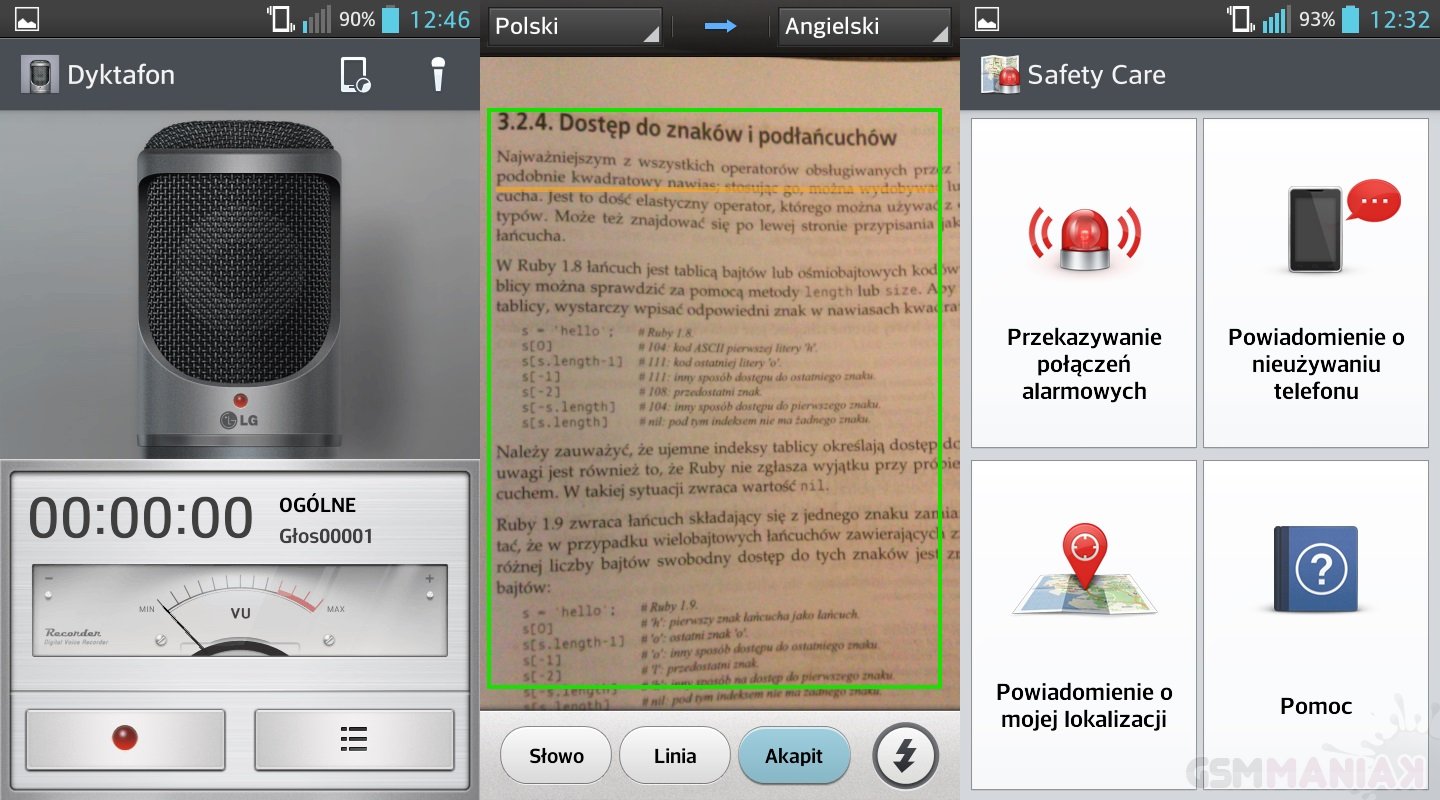 Inną ciekawą propozycją jest aplikacja, dzięki której będziemy mogli przetłumaczyć dokument przy użyciu aparatu. Program analizuje uchwycone słowo, linię tekstu bądź też cały akapit i przekłada na wybrany przez nas język. Nie jest to najwierniejszy tłumacz, ale pozwoli on na pochwycenie ogólnej treści tekstu. Na liście aplikacji znajduje się również eksplorator plików z obsługą Dropbox’a, Centrum Bezpieczeństwa oraz osobny sklep z aplikacjami LG.