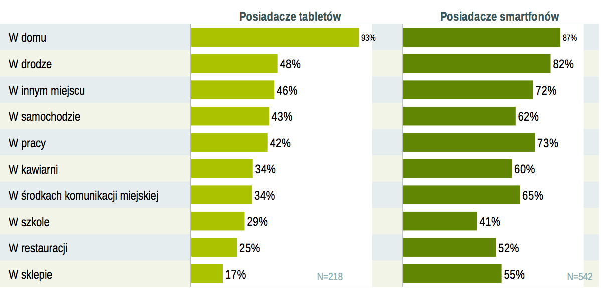 Bardziej szczegółowe badania wykazały, że 84% przepytanych wykorzystuje dostęp do Sieci w celu czytania wiadomości. 78%, druga w kolejności najwyższa wartość to ilość osób, które na małym ekranie obsługują pocztę mailową, a 74% poszukuje danych i informacji z różnych dziedzin. Co ciekawe, 70% korzysta ze smartfona jako nawigacji, 62% do skonsultowania rozkładów jazdy komunikacji miejskiej, a 61% do obsługi portali społecznościowych.