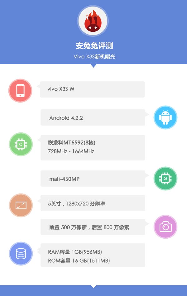 Vivo X3S W będzie pierwszym w asortymencie firmy urządzeniem wykorzystującym 8-rdzeniową jednostkę MediaTek MT6592 o maksymalnej częstotliwości taktowania 1664 MHz. Za grafikę odpowiedzialny będzie natomiast 4-rdzeniowy chip graficzny Mali-450MP4 o taktowaniu 700 MHz, który otrzyma wsparcie ze strony 1-gigabajtowej pamięci operacyjnej RAM. Na dane oraz multimedia zostanie zarezerwowane 16 GB wbudowanej pamięci, natomiast system Google Android 4.2.2 Jelly Bean prezentowany będzie na obszarze roboczym o rozdzielczości 1280 x 720 pikseli, na 5-calowym wyświetlaczu.