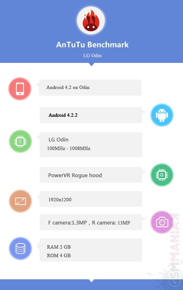 Według poniższych grafik, LG Odin podczas testów pracował pod kontrolą systemu Google Android w wersji 4.2.2 Jelly Bean, zaś obraz prezentowany był w rozdzielczości Full HD (1920 x 1080 pikseli), na wyświetlaczu o nieznanej przekątnej. Na dane oraz multimedia producent zarezerwował 4-gigabajtową pamięć wbudowaną, która pomieścić ma między innymi zdjęcia wykonane przy użyciu 13-megapikselowego aparatu głównego. Na wyposażeniu nie zabraknie frontowej kamery dedykowanej wideo połączeniom o matrycy 1.3 Mpx, a także 2-gigabajtowej pamięci operacyjnej RAM.