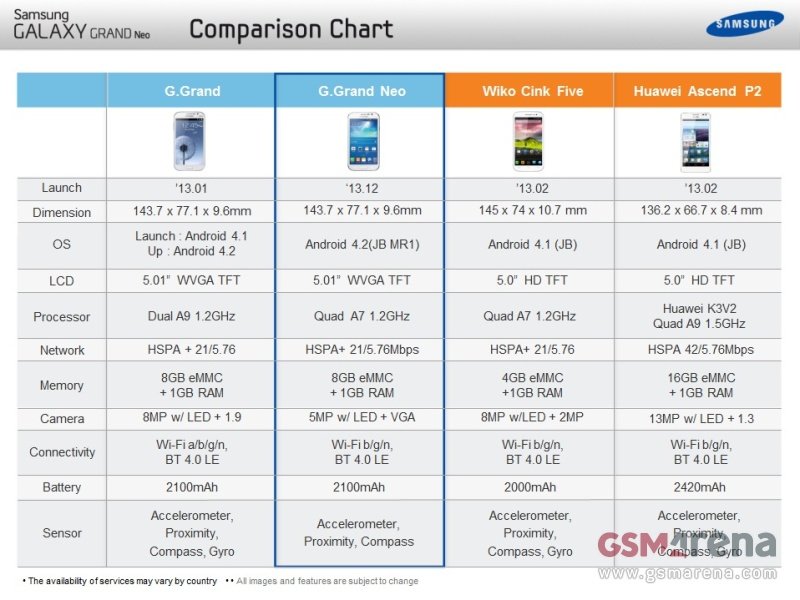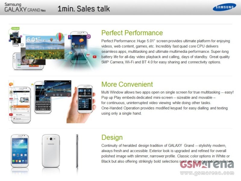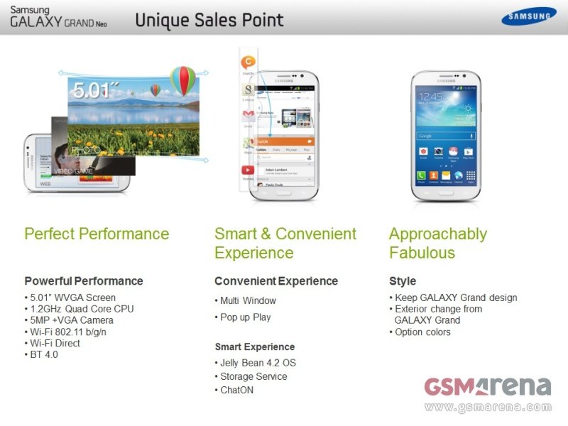 Samsung Galaxy Grand Neo zostanie wyposażony w 5-calowy wyświetlacz TFT, na którym obraz prezentowany będzie w rozdzielczości WVGA (800 x 480 pikseli). Moc obliczeniową oraz sprawną pracę systemu Google Android 4.2 Jelly Bean zapewni 4-rdzeniowa jednostka o częstotliwości taktowania 1.2 GHz, oparta o architekturę ARM Cortex-A7 oraz 1-gigabajtowa pamięć operacyjna RAM, zaś na dane Samsung zarezerwował 8 GB wewnętrznej pamięci.