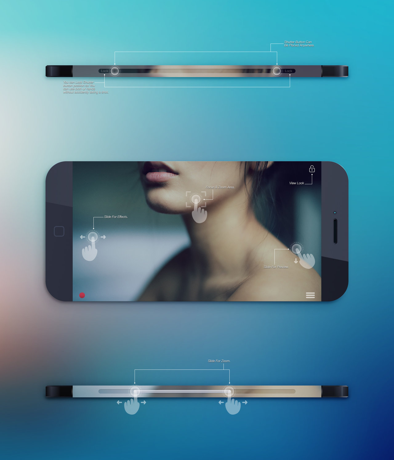 Utabayev proponuje iPhone’a, w którym ekran jest rozciągnięty po bokach. Jego zdaniem przyciski głośności, skrót do łączności i podstawowe elementy z centrum sterowania iOS-a powinny znaleźć się na lewym boku urządzenia, a home’a w ogóle Apple powinien się pozbyć. Wyamiary tego urządzenia są bardzo zbliżone do wymiarów iPhone’a 5s. Podobny projekt zaprezentowali również Fabio Basile i Claudio Guglieri, z którym mieliście okazję zapoznać się w sierpniu.