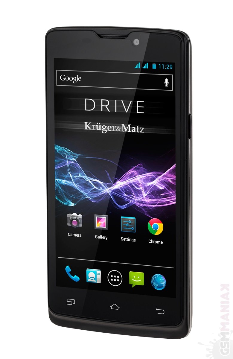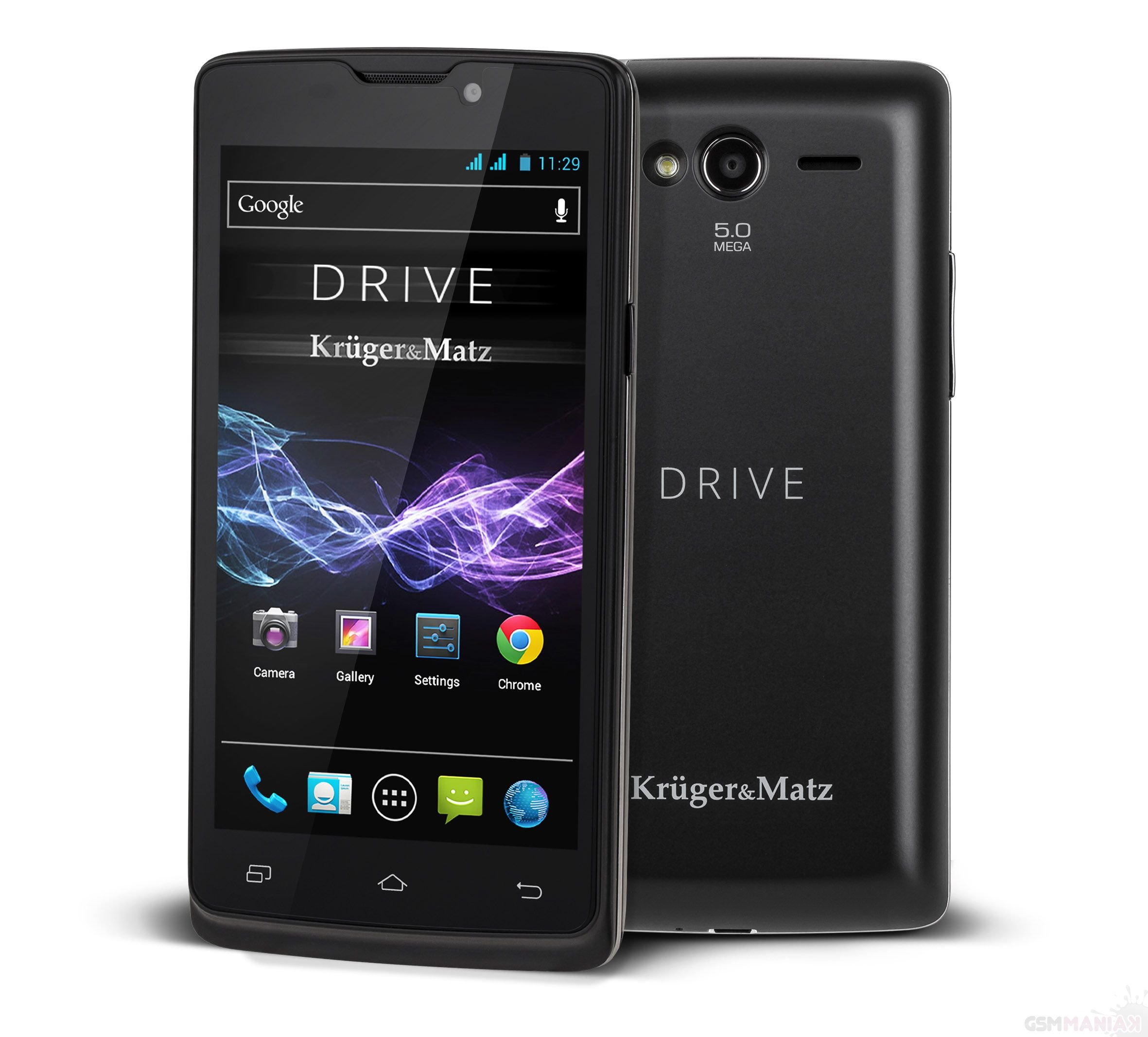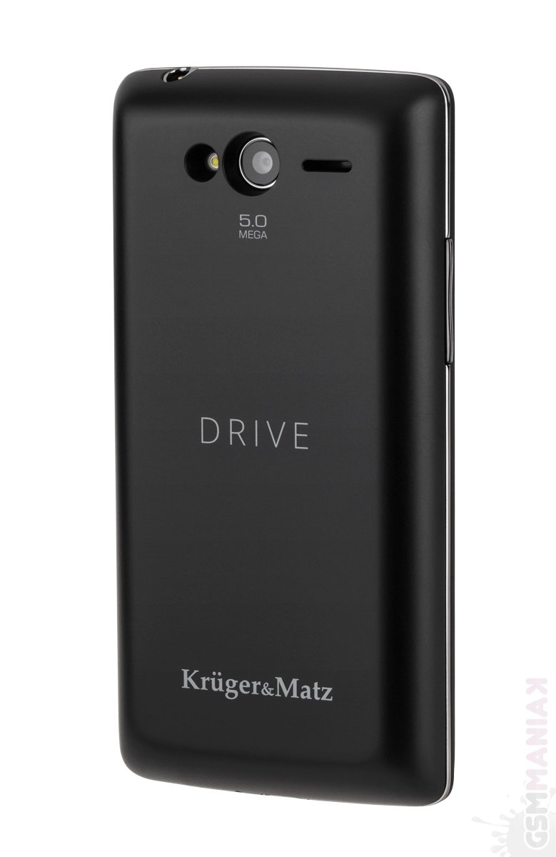 Kruger&Matz DRIVE to propozycja dla osób ceniących sobie długi czas pracy na jednym cyklu ładowania i będących w stanie poświęcić smukłą obudowę (13 mm), a także niską wagę, gdyż smartfon waży 150 gramów, przy zaimplementowaniu 4.5-calowego wyświetlacza FWVGA (854 x 480 pikseli), pokrytego powłoką ochronną Dragontrail. Moc obliczeniową oraz sprawną pracę systemu Gogle Android 4.1 Jelly Bean zapewnić ma 4-rdzeniowa jednostka Qualcomm MSM8225Q o częstotliwości taktowania 1.2 GHz oraz 1-gigabajtowa pamięć operacyjna RAM, zaś dane znajdą swoje miejsce w pamięci wbudowanej o wielkości czterech gigabajtów.