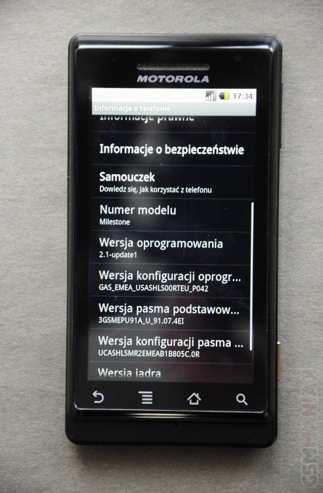 Na koniec parę słów o systemie operacyjnym. Jak już wspomniałem, Motorola Milestone trafiła do naszego kraju z Androidem w wersji 2.1, co widać na poniższym poniższych zdjęciu. Ów system działa bardzo płynnie, a wszystkie aplikacje otwierają się błyskawicznie.