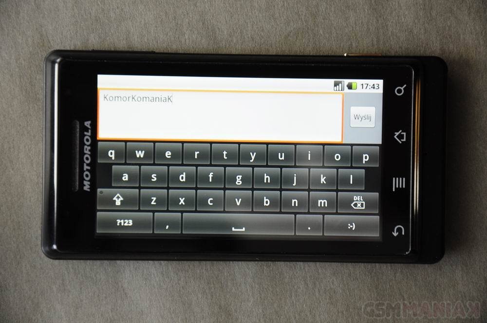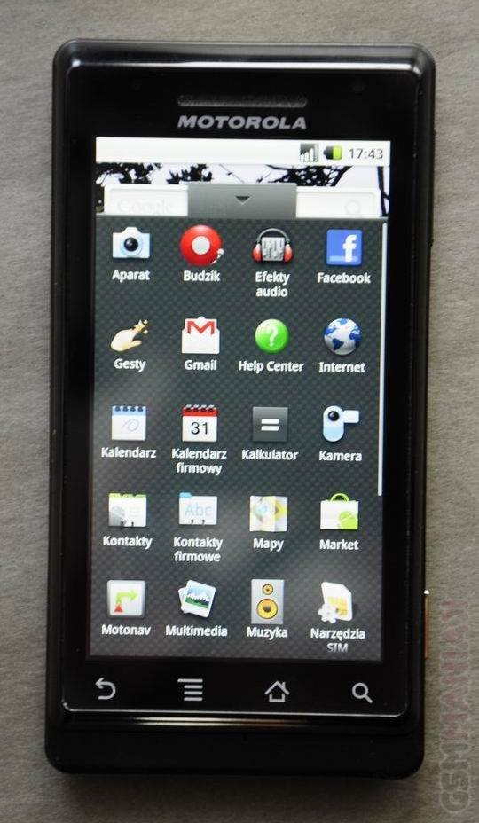 Na pokładzie Milestone znalazł się duży, bo 3,7-calowy, dotykowy ekran o rozdzielczości 480 x 854 pikseli. Wyświetlany na nim obraz jest bardzo dobrej jakości. Dotyczy to zarówno jasności, nasycenia kolorów, czy ostrości obiektów. Wprawdzie nie jest to AMOLED, z którym możemy spotkać się w Legend i Desire, ale pomimo tego świetnie daje sobie radę.
