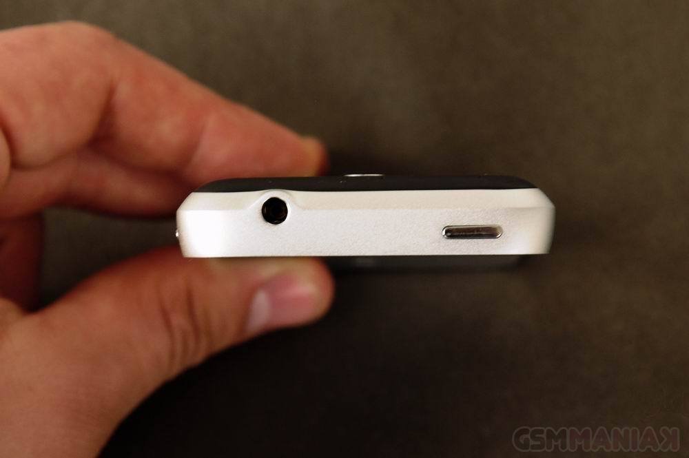 W tym momencie proponuję przejrzeć się przyciskom, gniazdom, które zostały rozmieszczone w różnych częściach obudowy. Zacznijmy zatem od górnego brzegu. Tkwi w nim przycisk „Power„, który podczas standardowego użytkowania służy do zdejmowania i zakładania blokady telefonu. Jest to tym samym nowość w porównaniu z Hero. Ów przycisk jest niewątpliwie drobiazgiem, ale z racji swojego wyglądu nadaje urządzeniu charakteru. Jest po prostu ładny. Obok umiejscowione jest wyjście słuchawkowe mini jack 3,5mm, czyli podstawa dla każdego fana muzyki.