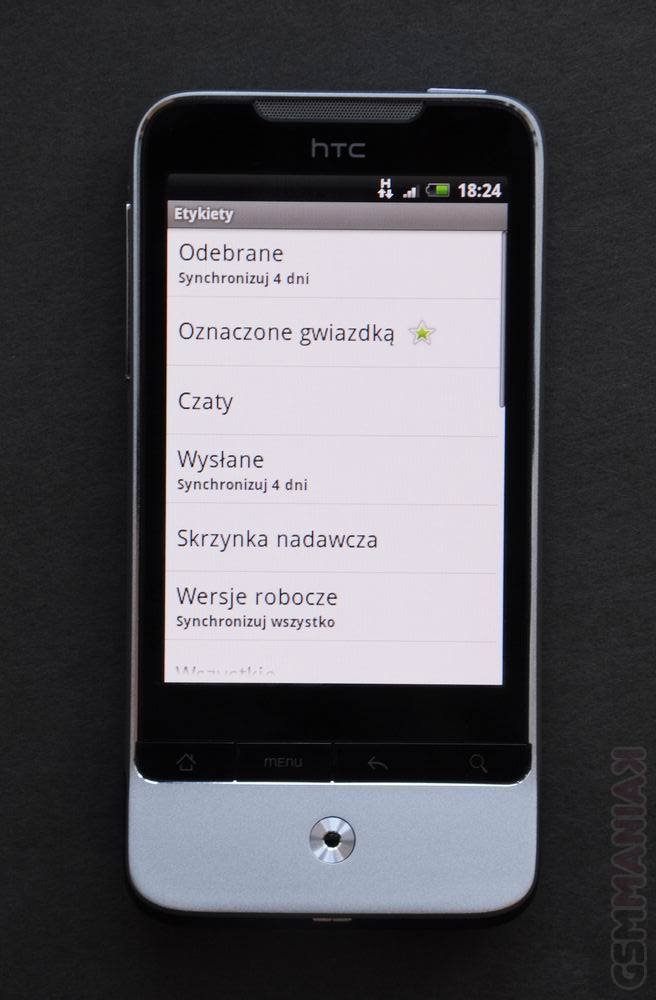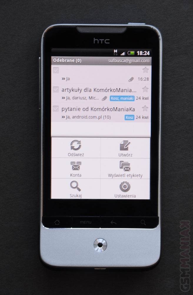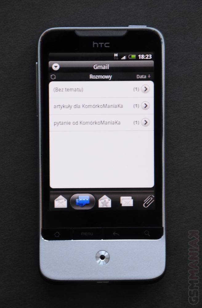 W HTC Legend znajdziecie pełną integrację z pocztą Gmail. W ogóle przy pierwszym uruchomieniu zostaniemy poproszeni o zalogowanie się na konto pocztowe. Na górnej belce będą pojawiać się powiadomienia o nowych wiadomościach w skrzynce. Pozwólcie jednak, że zacznę od początku.