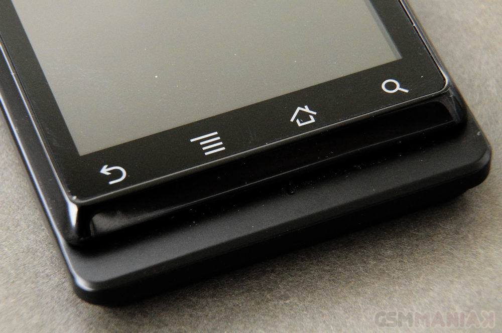 Warto w tym miejscu wspomnieć co takiego znajduje się z każdej strony Milestone’a. Główny, górny panel to praktycznie sam ekran. Nad nim znajduje się podłużny głośnik. Pod nim natomiast 4 dotykowe przyciski (nie będę starał się nazywać tych symboli, tylko po prostu napiszę za co odpowiadają): cofanie, rozwijanie menu opcji, powrót na ekran główny oraz charakterystyczne szukaj. W górnym prawym roku schowana jest jeszcze dioda sygnalizacyjna. Jej miganie na kolor zielony powiadamia nas o nowej wiadomości w skrzynce odbiorczej bądź mailowej. To jest wszystko, co możemy znaleźć na górnej części smartfona.