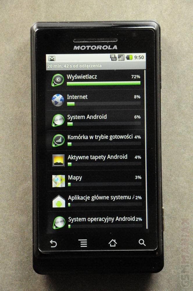 Przy włączonych „wszystkich opcjach” (3G +ciągłe monitorowanie poczty itd.) i średnio intensywnym użytkowaniu ( kilkanaście minut rozmów, kilka SMSów, kilkanaście minut w Internecie) telefon powinien pracować około 2 doby. Jeżeli wprowadzimy ograniczenia (wyłączone 3G), rzadsze sprawdzanie poczty, pobawimy się zarządzaniem energią (co daje spore pole do manewru) – czas ten wydłuży się na 3-4 doby. Wszystko w zależności od tego co i w jaki sposób zmienimy. Milestone jest jednak smartfonem, który nie powinien mieć nałożonych tego rodzaju ograniczeń. Bateria ładuje się szybko, więc nawet codzienne podpinanie do zasilania nie stanowi problemu.