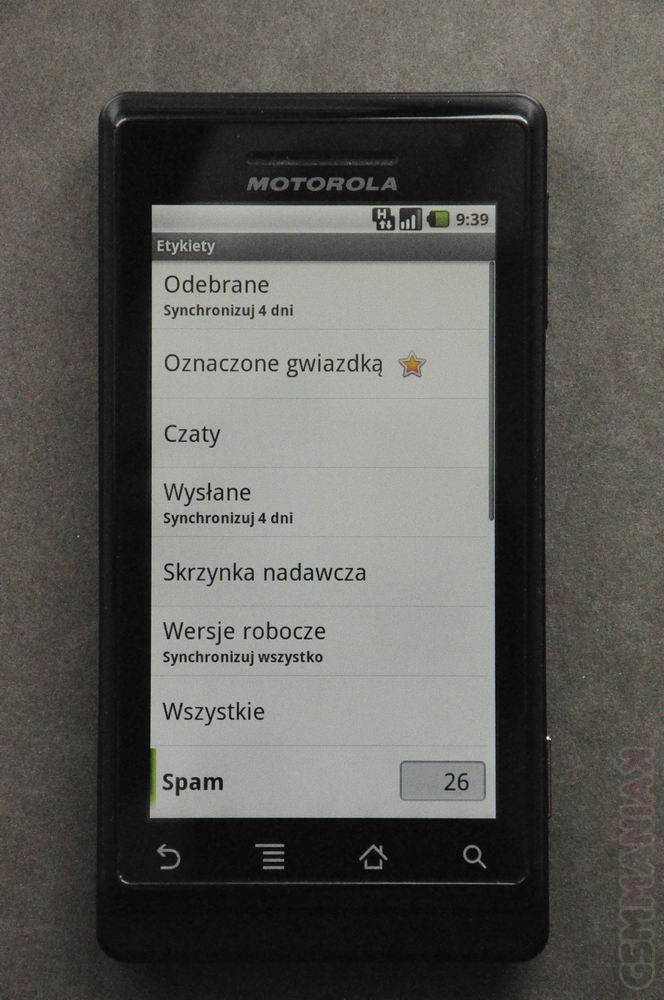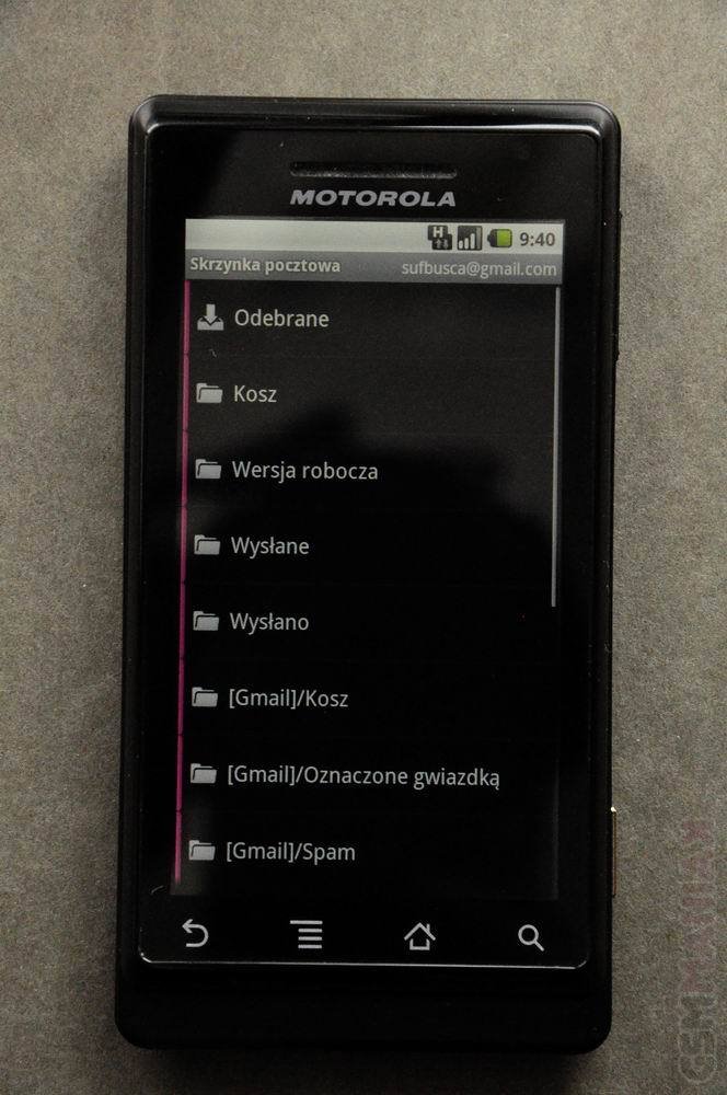 Pocztę możemy odbierać w dwojaki sposób. Po pierwsze przy pomocy specjalnie stworzonej do tego aplikacji – oczywiście Gmail. Jest to rzecz powszechna w telefonach z systemem Android. W głównym oknie mamy skrzynkę odbiorczą, a z menu opcji dostaniemy się do wszystkich etykiet. Program jest wygodny i dobrze się z nim współpracuje.