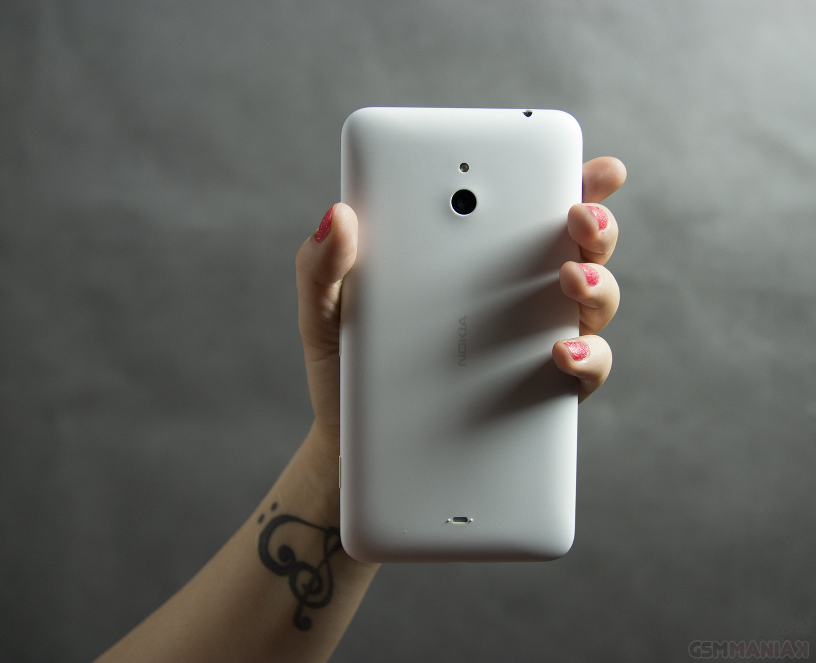 Wykonanie jest dobre – tylna klapka zbudowana jest z wysokiej jakości tworzywa sztucznego z dużą domieszką gumy: jest matowa, giętka i nie ślizga się w dłoni. Myślę, że nawet przy dłuższym użytkowaniu nie powinniście mieć problemu z pękaniem obudowy. Spasowanie przycisków znajdujących się na prawym boku urządzenia (głośność, włącz/wyłącz i aparat) jest po prostu idealne. Szukając wad na siłę mogę napisać, że przy naciskaniu obudowy w niektórych miejscach możemy usłyszeć trzeszczenie, ale generalnie jakość wykonania stoi na bardzo wysokim poziomie. Wracając jeszcze na chwilę do tylnego panelu – znajdziemy tam aparat główny, diodę doświetlającą, delikatne logo Nokii i całkiem przyzwoity głośnik główny (maksymalny, zmierzony w naszych testach poziom dźwięku wyniósł 80 decybeli).