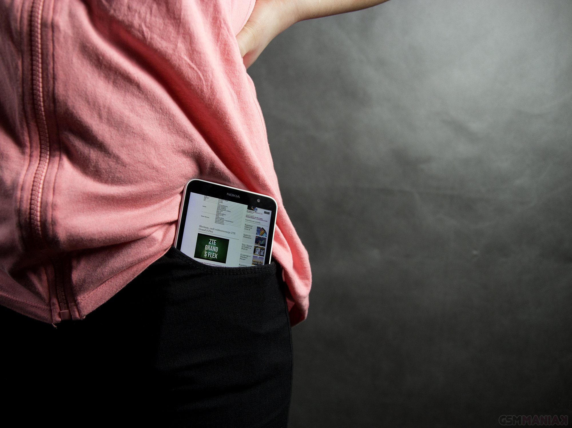 To bardzo ważna kwestia oczywiście – poruszam ją w tekście wyżej, ale podsumowując, kieszeń kieszeni nie równa – mi na przykład Lumia zmieściła się w kieszeni jednej z kurtek, bo ma je naprawdę bardzo pojemne, a w innych wystawała prawie połowa. Spodnie damskie (czytaj: obcisłe) nie mają szans zmieścić tejże Nokii, natomiast Panowie noszące bardzo szerokie spodnie – myślę, że jest to do zrobienia. Kieszenie typu w marynarkach, sukienkach – nie ma szans. Myślę, że warto przed zakupem skoczyć do Saturna, czy Media Marktu i spróbować na własnej kieszeni zmieścić sześciocalowe urządzenie. 😉