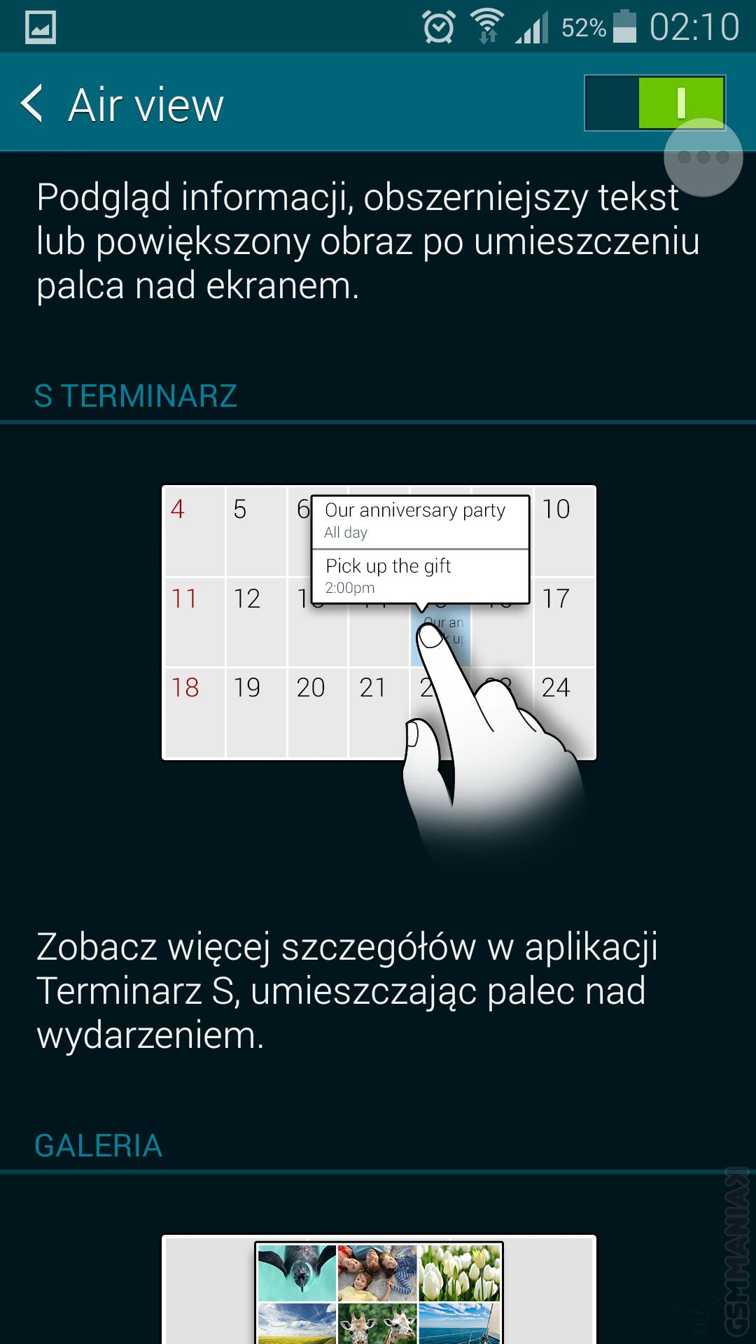 Nie jest to nowość, przy czym trudno byłoby jej nie omówić, skoro stanowi część najnowszego flagowca. Osobiście nie jestem fanem tej opcji – o ile „podglądanie” zawartości kalendarza jest praktyczne, tak już w SMS-ach i galerii potrafi napsuć trochę krwi. Przesuwanie palcem nad określonymi pozycjami często skutkuje wywołaniem niemałego zamieszania, czyli podświetlania wszystkiego, co się tylko da podświetlić. Prawdziwie świetnie Air View sprawdza się natomiast w zintegrowanym odtwarzaczu multimedialnym, gdzie mamy do dyspozycji podgląd sceny z określonego czasu. Brakuje natomiast możliwości wyłączenia tej funkcjonalności dla poszczególnych narzędzi.