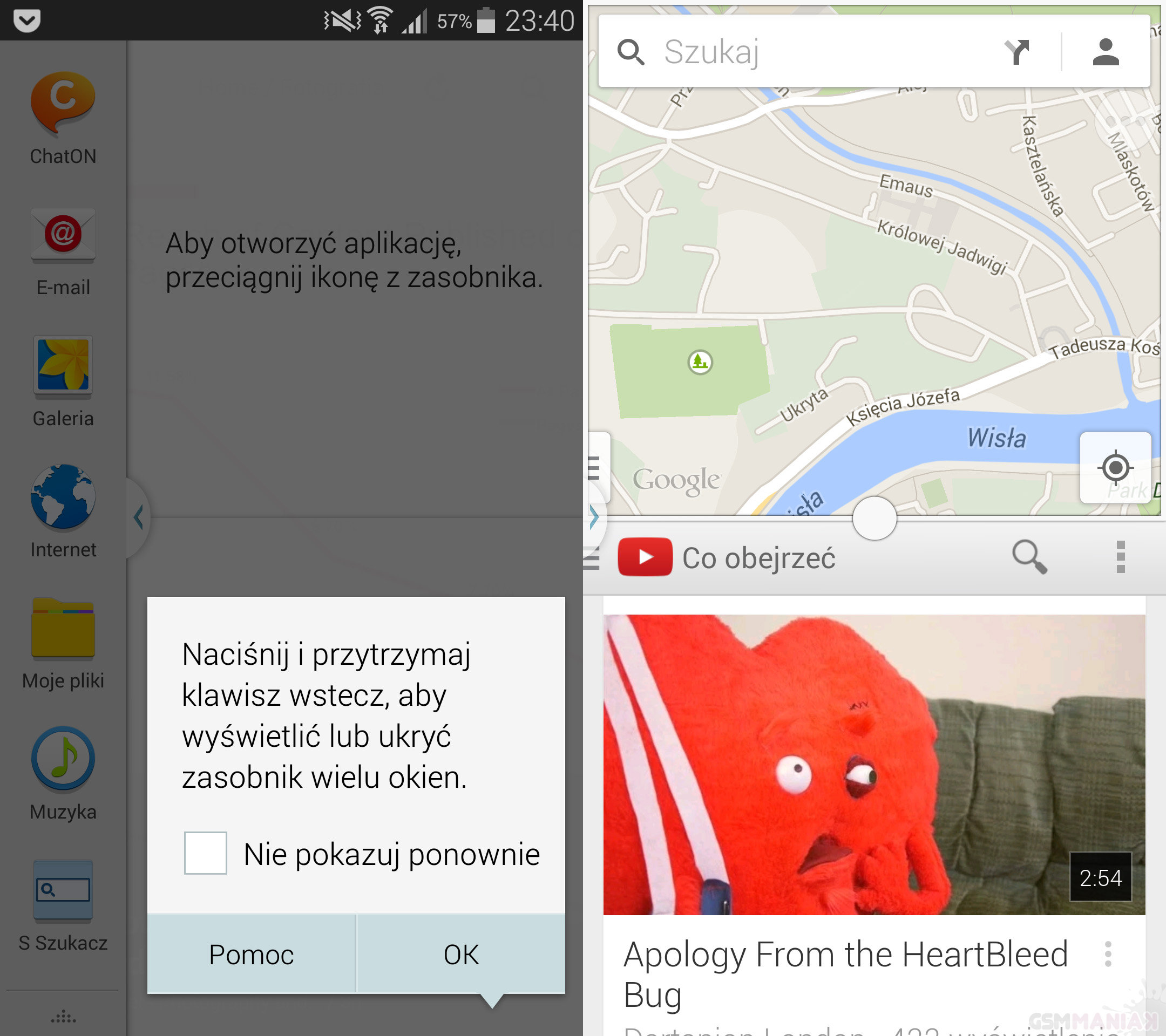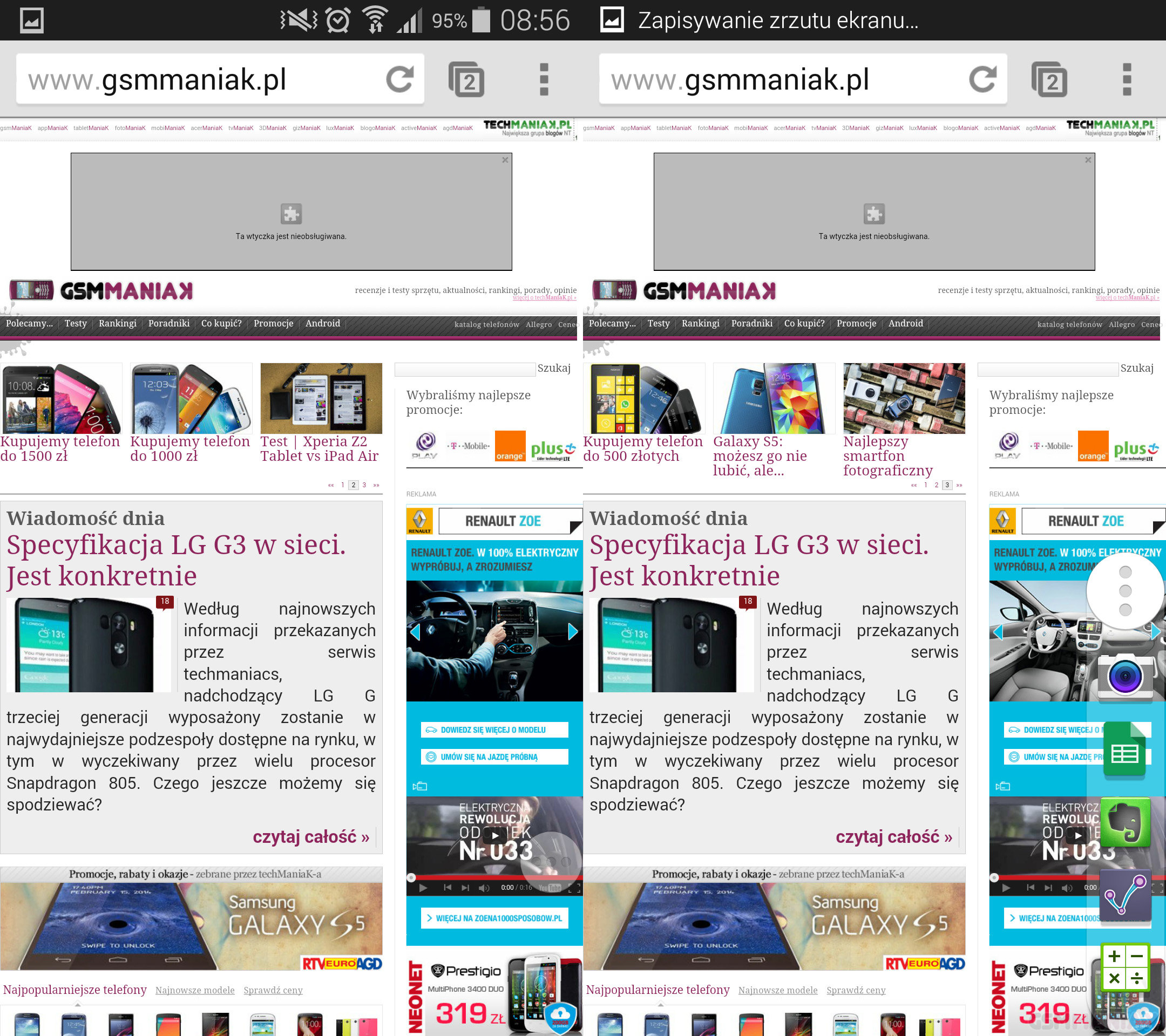 Samsung robi to najlepiej na rynku, pozwalając uruchomić dwa okna zupełnie różnych aplikacji (ze świetnym skalowaniem). O ile w Xperii mamy co najwyżej z poprawnym rozwiązaniem, tak w Galaxy faktycznie da się w ten sposób pracować – czerpać informacje z przeglądarki przy jednoczesnym sporządzaniu maila. Oglądać film i zapisywać cytaty w Evernote. Możliwości jest całkiem sporo.