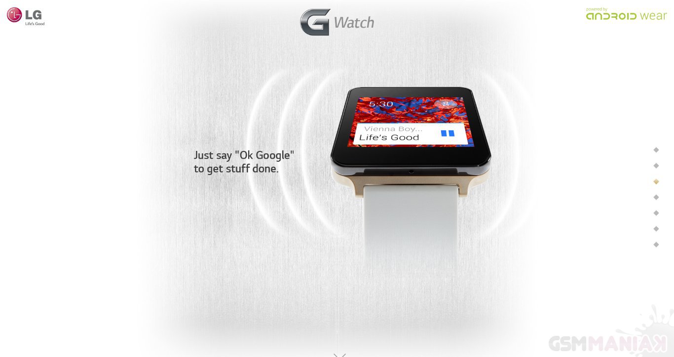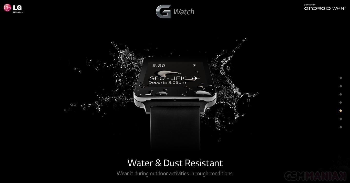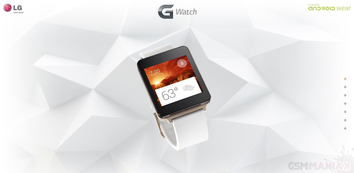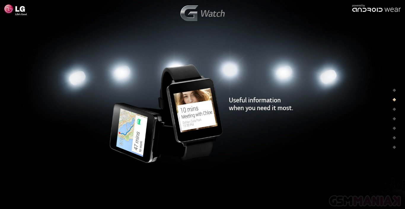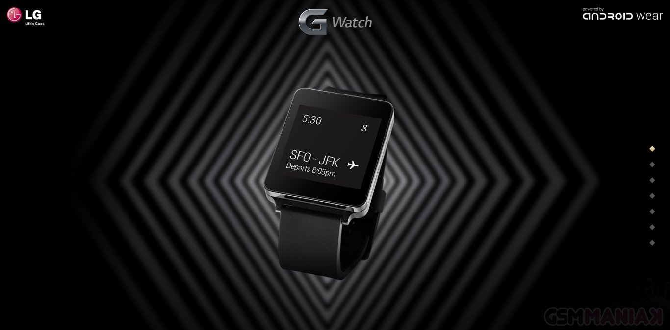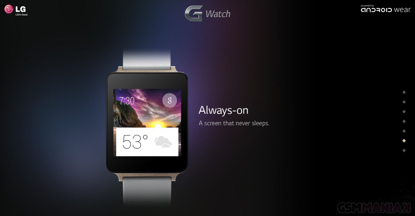 LG uruchomiło stronę dedykowaną nadchodzącemu LG G Watch, dzięki czemu dowiadujemy się, że „inteligentny” zegarek oferowany będzie w dwóch wariantach kolorystycznych – klasycznym czarnym oraz złotym. SmartWatch będzie posiadał obudowę odporną na przenikanie pyłu i wody, a także wyświetlacz, który zawsze będzie włączony, gdyż według informacji na stornie – nie zasypia.