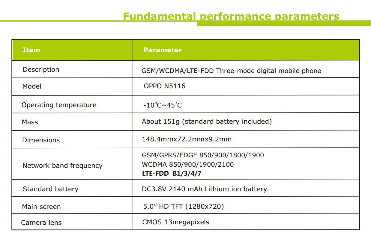 Z danych zgromadzonych w dokumentacji FCC wynika również, że Oppo N1 mini o wymiarach 148.4 x 72.2 x 9.2 milimetra będzie ważył około 151 gramów, a aparat główny będzie cechował się obecnością trzynastu megapikseli. Energię dostarczyć ma akumulator o pojemności 2140 mAh. Premiera rynkowa Oppo N1 mini, który oferowany będzie ze wsparciem dla szybkiej trafniejsi danych w standardzie LTE, a także w wersji z modemem 3G, na półkach sklepowych zadebiutować ma w maju lub czerwcu bieżącego roku.